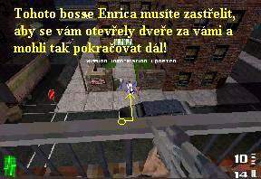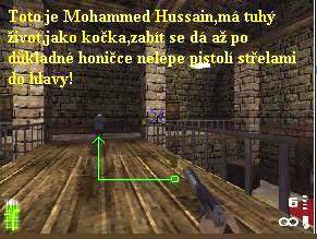 Nacházíte se na nádvoří před palácem Mohammeda Hussaina, sejděte vpravo po nakloněné cestě dolů, zatočte doleva a vejděte do vchodu vpravo. Mějte po celou dobu na zřeteli, že tento samozvaný vůdce teroristů je velmi dobře trvale střežen vojenskou ochrankou a že doslova za každým rohem, na každé věžičce i v oknech jsou poschováváni jeho vojáci a ostřelovači, kteří, jakmile vás spatří, okamžitě zahájí smrtonosnou palbu. Pravou nebo levou stranou se dostanete k tryskající fontáně, pokračujte kolem ní dopředu a vejděte naproti do vchodu. Zabočte doprava, potom do chodby vlevo a hned po schodech doleva nahoru. Dveře vlevo nejdou otevřít, tak vstupte do podloubí vpravo. Zlikvidujte další vojáky a pokračujte doprava dále, vpravo z balkonu nahoře sestřelte dalšího vojáka. Potom vstupte do podloubí dopředu, zabočte doprava, i zde je plno vojáků, jeden z nich je i nahoře na věži. Vyjděte doleva po schodech a konečně jste se dostali do paláce Mohammeda Hussaina. Nyní tedy již před vámi stojí poslední úkol, najít a zastřelit tohoto hlavního bosse teroristů. V chodbě pravou, nebo levou stranou pokračujte dál, na věžičkách jsou další ostřelovači, pokračujte chodbou vpřed, likvidujte další vojáky. Projděte podloubím, sejděte po schodech dolů a po likvidaci všech vojáků zabočte vlevo do chodby, jejíž podlaha je potažena červeným kobercem. Po tomto koberci pokračujte až na konec, kde vyjděte po schodech nahoru. Po dalším červeném koberci pokračujte dál, vlevo spatříte zamřížovanou chodbu. Jděte tedy k oněm mřížím, ty se samy před vámi zvednou a na konci chodby nejdete pancíř, seberte ho, bude se vám náramně hodit. Vrate se zpět, na koberci odbočte doleva k dalším mřížím, které se opět samy zvednou. Za nimi vás přepadne celá horda vojáků, musíte je všechny postřílet, poté si už musíte vzít na mušku samotného Mohammeda Hussaina, vyběhněte za ním po schodech nahoru. I tento výtečník má velmi tuhý život, jako již zmíněná kočka. Nastane velká honička, stále bude před vámi utíkat a střílet po vás. Vy na něho ale nepoužívejte samopal, lépe je si navolit pistoli a vždy ve vhodnou chvíli, nejlépe když před vámi utíká, ho střelit z pistole do hlavy, to budete muset několikrát zopakovat, než se vám ho podaří úplně zprovodit ze světa. Jakmile padne mrtev k zemi, vrate se po schodech dolů a zabočte doprava a utíkejte ven na nádvoří. Všude kolem vás je však plno vojáků, kteří se vám chtějí pomstít za smrt svého bosse, takže vᚠútěk nebude lehký. Doběhnete tak až na poslední nádvoří, kde už na vás čeká velmi početná, naštěstí už ale poslední velká pomstychtivá horda vojáků. Nyní je musíte v časovém limitu 90-ti sekund všechny do jednoho postřílet, jinak nemůže přistát vrtulník, který se nachází nad vámi a chce s vámi odletět do bezpečí zpět do domova. Pokud se vám podaří v tomto časovém limitu všechny vojáky pozabíjet, jste za vodou a vaše poslání v celé této hře končí. Dozvíte se něco o autorech hry a pak už na vás čeká jen poslední statistická tabulka. Takže mi zbývá jen vám popřát k vítězství, drželi jste se totiž opravdu statečně a jistě obdržíte i nějaké vyznamenání a tučnou zaslouženou finanční odměnu. To už ale ve hře není, to jsem si jen vymyslela, nebo to bylo to jediné, co mi ve hře chybělo! :-))