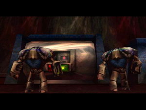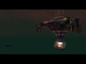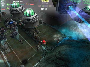 obrovský stroj. Po bokoch sú také zelené pologule, ktoré musíš zničiť