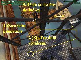 Vylezte si nahoru po žebříku, vpravo zastřelte, nebo uškrťte stráž. V této misi platí zásada, že projdete přes stráže buďto v dobrém, což znamená, že počkáte u bran, až půjde někdo jiný stejným směrem dál, jako vy, nebo si cestu dál prostřílíte, pak ale nesmíte nechat na místě boje nikoho živého, protože by zbylí podali na loď zprávu Borisovi, kde se právě nacházíte a on, pokud byste už byli blízko lodi, uteče z ní do svého auta. To spatříte v animaci, jak odjíždí a skončili jste. Protože jste jistě bojovníci, popíši vám cestu pomocí prostřílení se, je to však hodně náročné. Jakmile strážného zastřelíte (v té druhé variantě je nutno používat strunu), převlečte se do jeho šatů, pak se vracejte po kolejích doprava a rovno směrem k bráně, kde vymlaťte všechny vojáky, pozor, jsou všude i za vámi na střeše. Je jich zde celkem šest, tak budete mít vskutku co dělat. Pak běžte doprava, dostanete se k další bráně, kde si vše zopakujte. Nezapomeňte i na jednoho strážného na střeše. Od brány se dejte doleva kolem plotu, pobijte strážné i psy a pokračujte doprava. Neodbočujte k  bráně, pokračujte dál kolem vody, pobíjejte strážné a psy, až se dostanete ke kamiónu. Vejděte po malých schůdcích dovnitř, seberte z beden bombu, zaměřovací pušku, samopal a pistoli, pak vyjděte ven a po kolejích doleva pokračujte k další bráně, zde vše živé postřílejte, o kousek dál je další brána, zde udělejte totéž. Pokračujte vpřed a po chvíli zatočte doleva, nejdříve je nutné najít Borisovo auto, měli byste narazit přímo na něj. U auta zlikvidujte stráže, pak do něj uložte bombu a pokračujte vpřed a hned doprava k lodi. Zaměřovací puškou sundejte ostřelovače ze stožárů, utíkejte po schůdcích nahoru na loď, zbytečně se nepouštějte do boje. Dříve, nebo později, spatříte totiž v animaci Borise, který spustí časovanou nálož, která přesně za tři minuty iniciuje bombu dole v podpalubí a loď vylétne do povětří. Je tudíž vašim úkolem tuto rozbušku najít a zajistit ji. V animaci, která na chvíli přeruší vaši cestu uvidíte, jak Boris nastartuje svoje auto a spatříte nádherný výbuch, který ho vzal sebou přímo do pekla. Přeběhněte šikmo přes palubu a z boční strany lodi vstupte do prvních dveří vpravo. Nyní se musíte prostřílet stále níže a níže, až se dostanete do skladu, z něj do strojovny, kde musíte zastřelit tři muže v bílých tričkách, ze strojovny po schůdcích nahoru a tam už jenom zrušte odpočítávání. Pak se vracejte stejnou cestou zpět na palubu, pobíjejte zbytky gangsterů, teď už vás čas netlačí, tak si to pěkně po tom napětí vychutnejte. Z paluby si vylezte po žebříku do kapitánské kajuty, kde klidně zlikvidujte kapitána, s odplutím si poradíte sami. Přistupte k řídícímu pultu a pozor, v animaci odplouváme z této mise do další……..