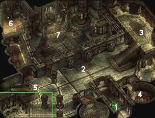 1. Sem se dostanete pomocí tajného průchodu z Helmova svatostánku. Váš úkol je najít 6 klíčů (jak je psáno v pergamenu, který máte) a otevřít dveře č. 9 a následně se dostat do prostoru označeného 10. Krypta je plná nemrtvých, takže dejte pozor a často ukládejte.