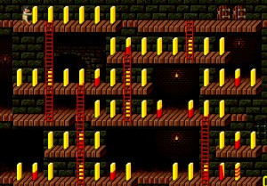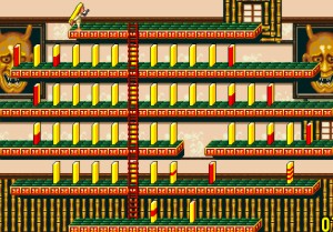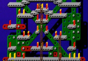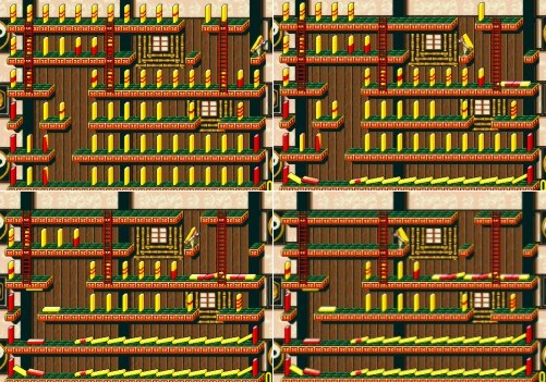 - slezte po žebříku až úplně dolu a vezměte za řebříkem kostku se kterou skočte na rozvírající. totéž opakujte o patro výš, ale až nahoře musíte vzít kostku zprava ze shora a stou skočit na rozvírající. Teď teprve jděte strčit do poslední řady.