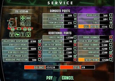 Pri každej súčiastke je uvedená cena ak si ju chcete zaobstarať zaškrtnite políčko vedľa ceny a stlačte PAY. Ak si chcete kúpiť všetky súčiastky zaškrtnite políčko EVERYTHING a stlačte PAY. Pre zrušenie stlačte