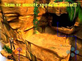 přeskočte na pevnou plošinku vpravo. Přidržujte se skály, tak se dostanete