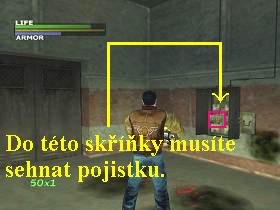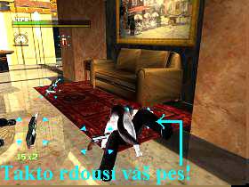 Po skončení úvodní animace, ve které si pohovoříte s tanečnicí, bude vaším úkolem nepozorovaně projít přes celý sál až na druhou stranu. Tato akce je náročná na postřeh a rychlost vašich reakcí, takže se na to dobře připravte. Jakmile se tedy objeví herní tabulka, klikněte třikrát na levé tlačítko myši, tak se začne tanečnice na pódiu předvádět, na spodní liště se vám začnou přisouvat zprava doleva šipky, natočené do všech čtyř světových stran. Jakmile se některá dostane až do čtverečku na liště, klikněte rychle na kurzorovou klávesu, odpovídající svojí polohou zmíněné šipce. Pokud uděláte chybu, ubude část duhového ukazatele na liště, pakliže tento zmizí docela, skončili jste, budete totiž spatřeni a můžete pokus opakovat. Tento popsaný postup musíte úspěšně zopakovat třikrát po sobě, po každém úspěšném pokusu si v animaci všimněte, že zatím co pánové jsou zaujati půvaby kroutící se tanečnice, vy se přesunujete od sloupu ke sloupu a tak se kryjete před jejich zraky (obr.2). Jakmile se vám tedy podaří přejít (po třech úspěšných pokusech), ocitnete se v zeleně nasvícené chodbě, vydejte se doleva po schodech nahoru a vlevo za plentou v rohu na zdi je malý červený čtvereček. Klikněte na něj akčním tlačítkem a jakmile zezelená, spatříte v animaci, jak jeden z přihlížejících otrapů napadne tanečnici a počne na ni zle dotírat. Jakmile ji pustí, musíte se s ním dát do rvačky na parketě, přiběhne ještě několik dalších parchantů, které musíte všechny zneškodnit. Podotýkám, že v této a další fázi boje nesmíte mít u sebe žádnou zbraň a to ani skrytou, neboť byste nemohli, i kdybyste zvítězili, dostat se po soubojích z parketu dál a skončili byste. Bojovat tedy musíte pouze pěstmi (levé tlačítko myši) a kopanci (Q), pakliže se všech padouchů zbavíte, objeví se jejich kápo jménem Boris a musíte stejnými prostředky pokračovat v souboji s ním (ukazatele množství zdraví máte oba nad svými hlavami). Poté, co se zbavíte i tohoto zmetka, spustí se animace, v níž vyběhne z výtahu fůra po zuby ozbrojených zabijáků, které musíte zlikvidovat. Nyní již střílet nejenže můžete, ale musíte, vyběhněte z parketu do přízemí, lotři jsou všude dokola a další ještě nahoře v patře. Nebudu vám popisovat, v jakém pořadí a jak je máte sejmout, ostatně jejich výskyt se generuje pokaždé jinak a je tudíž zcela nahodilý, jen vás upozorním na to, že jak v přízemí tak i v patře je po okolí a v přilehlých chodbách mnoho lékárniček a na zdích láhví s výbušninou, takže se do těchto bastardků s vervou pusťte a známým způsobem je buďto po jednom, lépe ještě po celých houfech pobíjejte, při tom nezapomeňte na sbírání nábojů po mrtvolách a využívejte všech možností krytí. Láhve jsou velice účinnou zbraní, pokud k ní přistoupíte, seberete ji, spusťte auto zaměření, vyberte si největší hlouček, hoďte tím směrem láhev a jakmile se tato ocitne v blízkosti party darebáků, znovu ji zaměřte automatickým zaměřovačem a vystřelte do ní, výsledek je nad všechna očekávání. Jakmile tedy postřílíte tuto bandu parchantů, objeví se další dva, kteří se již lépe kryjí a utíkají před vámi do různých úkrytů a mají i mnohem razantnější zbraně. Kryjte se tedy také, potom co je zlikvidujete, nastoupí na vás sám veliký boss Dimitrij, ten je nejsilnější, má nad sebou vlastní ukazatel zdraví, nesmrtelný ale není, dejte mu tedy pokouřit a pošlete ho k čertu. Musíte sebrat jeho zbraň, tak se vám objeví hláška, že dole v přízemí se vám zpřístupnil výtah. Sejděte tudíž do přízemí a na konci chodby vlevo si přivolejte výtah, chvíli vyčkejte a pak si nastupte, v kabině aktivujte šipky, tak se výtah rozjede. Nahoře vystupte a hned před sebou zastřelte dva hlídače, pokračujte doleva, nyní si musíte prostřílet cestu mezi několika bandity až na konec chodby. Přesila je to obrovská, využívejte tudíž známou metodu „živých štítů“, na konci seberte pancíř a odbočte doleva, vlevo za obloukem je na zemi lékárnička, poté vstupte do dveří vpravo. V animaci spatříte bandu radících se zlotřilců, z nichž jeden vám ale uteče, v reále všechny ostatní postřílejte, na konci projděte dveřmi, spustí se nová animace. V reále pak zlikvidujte všechny pobudy, pozor na laserové paprsky, kterými si pomáhají ke krytí, brání vám jimi v dalším postupu, jakmile bude vzduch čistý, posbírejte vše, co můžete, nezapomeňte na lékárničky. Za pultem vpravo aktivujte časový spínač, tak jste si otevřeli dveře před vámi, rychle tam utíkejte a vstupte do dveří dříve, než se znovu uzavřou. V animaci spatříte prchajícího darebáka, který vám unikl z místnosti, v reále vás napadnou po zuby ozbrojení bandité, kolečkem myši si vybírejte zbraně, k dispozici tak budete mít možnost vyslat proti darebákům i vašeho psa, jakmile si nastavíte jeho siluetu, klikněte na levé tlačítko myši (střelba) a tak ho vyšlete dopředu (je nutné vždy na chvíli ho nechat odpočinout, než ho budete moci znovu použít). Prostřílet se takto musíte až na samý konec ulice, po zlikvidování jedné party narazíte na pochodu vpřed na další, vzhledem k tomu, že v této části hry ji nelze ukládat, prohledávejte uličky a výklenky vlevo, kde jsou lékárničky a pancíře. Pokud pobijete jednu partu, vracejte se zpět a posbírejte vše, co jste nemohli sebrat kvůli plnému inventáři, hlavně si doplňujte zdraví, teprve potom pokračujte po ulici dál a pouštějte se do nových soubojů. Mezi každým vyhraným soubojem se bude spouštět animace, v níž spatříte prohnaného uprchlíka, jak prchá st