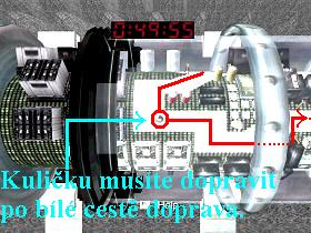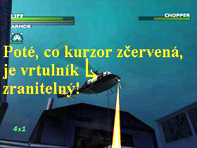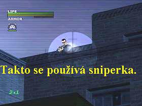 Po skončení úvodní animace, kdy si telefonicky promluvíte s Eve a dozvíte se od ní, že se cítí ohrožená, půjdete za ní a zatím co reportér připravuje komentář, nasednete do jeho vrtulníku a přispěcháte Eve na pomoc. Musím vás upozornit, že v této části hry vám toho příliš neporadím, neboť bude záležet čistě jen na vás, vaší rychlosti ve střelbě a přesnému míření, neboť nic jiného než samá přestřelka (kromě deaktivace bomby, jejíž postup vám vysvětlím) na vás nečeká. Jakmile se tudíž ocitnete v reálu, nacházíte se ve zmíněném vrtulníku, rozstřelte růžová okna a pomáhejte Eve likvidovat hordy banditů, kteří ovšem sem tam zaútočí i na vás. Hlavním cílem pro ně je ovšem Eve, takže se zbavte všech darebáků co nejdříve, ukazatel jejího zdraví máte hned pod svým vlevo nahoře, berte na vědomí, že Eve nesmí zemřít, jinak končíte a musíte začínat znovu. Doporučuji zde hru často ukládat, abyste se nemuseli stále vracet po novém spuštění hry na začátek. Jakmile tedy postřílíte všechny padouchy, Eve přeběhne dál, v animaci uvidíte, že narazila na banditu, který má v kufříku bombu, tu tedy nyní budete muset deaktivovat v časovém limitu jedné minuty. V bombě je umístěna malá kulička, což je vlastně detonátor, neboli roznětka, kterou musíte po bílé klikaté dráze dovést zleva doprava až na druhou stranu. Kuličkou pohybujete pomocí kláves D a A do stran, kurzorovými šipkami nahoru a dolů, spojením pohybu do stran a kurzorovou šipkou pak docílíte úhlopříčného pohybu. Pokud se kuličkou dotknete některého mantinelu po bílé cestě, tato zčervená, což je varování, že brzy vybuchne, takže ji rychle odveďte zpět na bílou plochu (obr.7). Pokud projdete mez dvěma anténami, získáte malý časový bonus. Jakmile se vám podaří projít až na konec, Eve bude pokračovat dál po cestě do dalšího patra a budete znovu muset pobíjet všechny darebáky, usilující o její život. Zde je to situační stereotyp, který není nutno dále popisovat, prostě střílejte stále o sto šest, tak Eve doběhne až na střechu, kde ji v animaci zabije padouch jménem Patch, vy v reálu poletíte dál, postřílejte bandity na střeše, pak zničte všechny ostatní, kryjící se za motocykly a auty, jakmile se vám to podaří, spustí se animace a po jejím skončení nastane honička. Máte neomezený počet nábojů, takže držte neustále tlačítko pro střelbu (levé tlačítko myši), zaměřujte zelený kurzor na auto, které se vám nabízí a hledejte na autě místa, kde kurzor zčervená, tak postupně auto pomalu a jistě zlikvidujete (ukazatele životnosti jednotlivých aut máte vpravo nahoře na obrazovce), jen pozor, jakmile kurzor zmodrá, je to signál, že musíte znovu nabít, pusťte tedy tlačítko pro střelbu a znovu je stiskněte. Tak zlikvidujete oba doprovodné sedany, nyní je na řadě auto s Patchem, po jeho zničení se spustí animace, v ní seberete mrtvému banditovi komunikační zařízení a tak misi zakončíte.