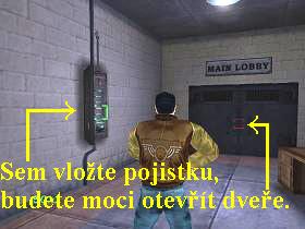 Nacházíte se tedy ve velice nepříjemném počasí, neboť lije jako z konve na nádvoří plném nepřátelských vojáků, dva z nich jsou i na okolních věžičkách, prostřílejte si tedy cestu na druhou stranu a tam na konci vpravo se pokuste aktivovat červený spínač. Tak spustíte animaci, ve které vrtulník spustí dolů výsadkáře ve žlutých kombinézách, zlikvidujte tudíž vojáky v zelených uniformách, jednoho „žluťáska“ rafněte pod krkem a dotlačte ho ke zmíněnému tlačítko, toto zezelená, picněte zajatce a tlačítko aktivujte, tak jste si zpřístupnili bránu na druhé straně. Rychle se tam rozběhněte, stiskněte nyní již zelený spínač, tak se ocitnete za branou před schody vedoucími dolů. Prostřílejte si cestu dolů, likvidujte vojáky i výsadkáře, které v animaci vysadí vrtulník, tak doběhnete k bráně, kterou nelze otevřít. Vydejte se tedy nahoru do protisměru, v malém přístřešku stiskněte tlačítko na panelu, teď jste si dole zpřístupnili zmíněnou bránu, ale zároveň vrtulník v animaci vysadí další vojáky. Prostřílejte si tedy zpět cestu k bráně, k dispozici máte i zápalné láhve, projděte jí a po skončení animace pokračujte dál, vyběhněte po schůdcích a vyčistěte plácek od vojáků. Odbočte doleva na dřevěné schody, seběhněte dolů a zkuste aktivovat červené tlačítko na konci. Tak znovu přivoláte vrtulník s výsadkem, vraťte se nahoru, zlikvidujte výsadek a tentokráte i vrtulník, z poslední mrtvoly vypadne klíč, který seberte a vraťte se dolů, nyní už je tlačítko zelené, stiskněte ho tedy. Spustíte tak animaci, po jejím skončení se ocitnete v podzemní chodbě, za neustálého likvidování nepřátel pokračujte přes dveře zpět. U dveří JCT 4A stiskněte červený spínač, tak přivoláte další vojáky, všimněte si odkud vyběhli, protože těmito dveřmi pokračujte dál. Vstupte do nově zprovozněných dveří JCT 4BL, prostřílejte si cestu chodbou dopředu, na jejím konci vstupte do dveří vpravo, prostřílejte si cestu k dalším dveřím, jakmile jimi projdete, postřílejte vojáky a odbočte doprava. Vyběhněte nahoru po schodech, odbočte doleva, vstupte do chodby naproti vlevo. Zastřelte vojáka v poslední místnosti, seberte po něm ze země kód kartu a prostřílejte si známou cestou příchod zpět až ke dveřím JCT 4A, nyní již jimi projdete. Na konci vstupte do dveří vlevo (pravé jsou nepřístupné), pokračujte přes několik dveří vpřed, stále likvidujte nepřátele. Vyběhněte po schodech nahoru, postřílejte další vojáky, výtah na konci však nefunguje, musíte sehnat do rozvaděče pojistku (obr.12). Vraťte se tedy zpět až k nepřístupným dveřím, nyní již jimi projdete, vstupte do chodby, postřílejte vojáky, odbočte do dveří vlevo a projděte do místnosti naproti. Zde zastřelte vojáka, vypadne z něj pojistka k výtahové skříňce, seberte ji, vraťte se nazpět k výtahu, postřílejte nové členy ochranky a pojistku vložte do skříňky, teď už můžete projít dál dveřmi vlevo. Seběhněte po šikmé ploše před vámi dolů, tak se spustí animace, po jejím skončení musíte pěstmi zabít tlouštíka s doutníkem, je to jednoduché, je nemotorný až běda. Poté, co se ho zbavíte, vstupte za vámi do dveří a v chodbě vlevo aktivujte přístroj. Spustí se nová animace, po ní se ocitnete na schodech. Nyní musíte aktivovat pět různě položených náloží, seběhněte po schodech dolů, pobijte vojáky. Jedna nálož je na vysokozdvižném vozíku, druhá na bednách vlevo, třetí naproti na rozvodech, čtvrtá na skříňkách vpravo a poslední pátá na spodní straně přídi letadla. Jakmile zaktivujete tuto poslední nálož, spustí se animace a po jejím skončení budete muset v časovém limitu devadesáti sekund zlikvidovat dvě velice čilé ženy- gangsterky, jménem Shadraku a Meeshaku a ještě stihnout utéci k malým schůdkům a nad nimi projít dveřmi. Není to tak obtížné, jak by se mohlo zdát, vyberte si ty nejrazantnější zbraně, kryjte se a palte do nich o sto šest. Jakmile je obě skolíte, utíkejte ke zmíněným malým schůdkům, vyběhněte po nich nahoru a rychle projděte dveřmi. Tak se spustí závěrečná animace, v níž se vám povede doslova husarský kousek a přejdete tak do další kapitoly.