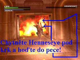 Po úvodní animaci se nepokoušejte postřílet kolem sebe nepřátelské vojáky, ale utíkejte doprava a vstupte do dveří, tak se spustí další animace a otvorem ve stropě se začne dolů snášet výsadek z vrtulníku. Zde postřílejte nejbližší vojáky, vyběhněte do prvního poschodí, seberte tam výkonné zbraně, od zábradlí spusťte ruční zaměřování (F) a šijte do vrtulníku z kulometu, občas se rozhlédněte po okolí, ať vás zblízka neskolí nějaký pilný voják. Jakmile vrtulník sundáte, objeví se boss jménem Hennesey, který má modře jiskřící štít, jsou to elektrické výboje, pokud s ním do vás bací, ubírá vám tak životní energii. Na něj neplatí žádné zbraně, má nad sebou dva ukazatele, horní je jeho síla, ten tenký spodní energie jeho štítu. Stoupněte si tedy ke kašně do vody a jakmile se jeho jiskření štítu změní z modré barvy na červenou, vyjděte proti němu, rychle uskočte zpět do vody, on skočí za vámi a dostane elektrický šok, že jste byli úspěšní poznáte podle toho, že udělá pěkný kotrmelec dozadu a ubude mu část spodního ukazatele, tedy energie jeho štítu. Poté, co tuto lest zopakujete asi desetkrát, zmíněný ukazatel zmizí a boss uteče před vámi dál, vy se po malé animaci ocitnete v chodbě. Proběhněte rychle kolem vojáků až ke dveřím, seberte před nimi pistoli a oddělejte je, tak si zachráníte plné zdraví a celou kapacitu pancíře, což se vám bude hned za chvíli velice hodit. Projděte dveřmi, v animaci zjistíte, že se na vás Hennesey už chystá, musíte teď s ním svést úspěšný pěstní souboj, neboť získanou pistoli vám ještě v animaci vykopne z ruky. On má pěsti obklopené plameny, vy zase plné zdraví a ochranný pancíř, takže síly jsou vyrovnané. Používejte tedy pěsti a kopance tak dlouho, pokud v animaci nepřistoupí k peci a neotevře její dveře, kam vás bude chtít srazit, v čemž ho samozřejmě musíte předejít. Poté, co mu zůstane jen poslední špetka jeho životní energie ho nasměrujte k peci, chyťte ho pod krk (E) a tlačítkem střelby ho vhoďte do plamenů v peci (obr.13), tím zakončíte vítězně nejen tento náročný souboj, ale i celou tuto hru. Spustí se hezká, poměrně dlouhá animace, tak zjistíte, že jednou opět dobro zvítězilo nad zlem a můžete být spokojeni, že jste se o to zasloužili právě vy a váš pes. Potom…, no vlastně není už žádné „potom“, pokud za to ovšem nepovažujete běžící závěrečné titulky.