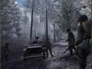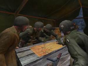 Na začátku proběhne porada (obr. 1), pak následujte vaše bojovníky. Spolu s nimi se střetnete s nepřítelem. Schovejte se za kládami , je zbytečně střílet na nepřítele, když máte jenom 10 kulek. Vaše skupina neudrží pozici, protože se objevili nepřátelské Tigery. Utíkejte zpět k místu, odkud jste začali, naskočte na jeep (obr. 2) a spolu s přeživší se prostřílejte přes německé obležení. Vašim jediným úkolem v jeepu je ostřelovat nepřátele, jinak se kochejte nádhernou krajinou.