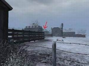 Proběhne porada (obr. 1), pak následujte své muže k městu (obr. 2). Přebíhejte mezi díry v plotě, dokud se nedostanete ke zdi stodoly, kde jsou lékárničky, poblíž leží mrtvý voják se sniperkou. Seberte ji a zabte nejdříve kulometčíky v oknech, pak dostanete úkol, zabít chlápka, který navádí dělostřelectvu. Tento voják je schovaný na střeše a má dalekohled (obr. 3-červená šipka), po jeho zabití dojde k zásahu na plot, takže to vám umožní pokračovat v cestě do města.