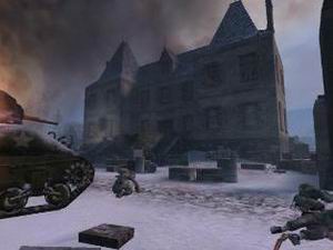 Na ulici se dejte směrem k zámečku a zabte kulometčíky v oknech. Za chvílí vám přijede na pomoc tank, ale bohužel ho dostane minometčík, tank prorazí zdi (obr. 6).