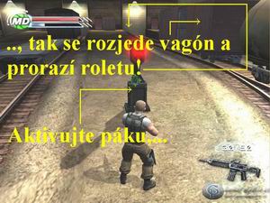 strelbou do červených sudov. Vyčistite oblasť (pozor na raketometčíka)