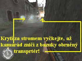 druhý německý tank. Samopalem zlikvidujte německou pěchotu, použijte kouřový