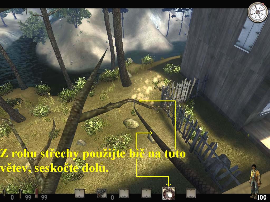 k nahoře doleva vyčnívajícímu trámku. Na něj použijte bič,
