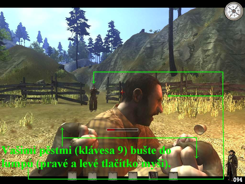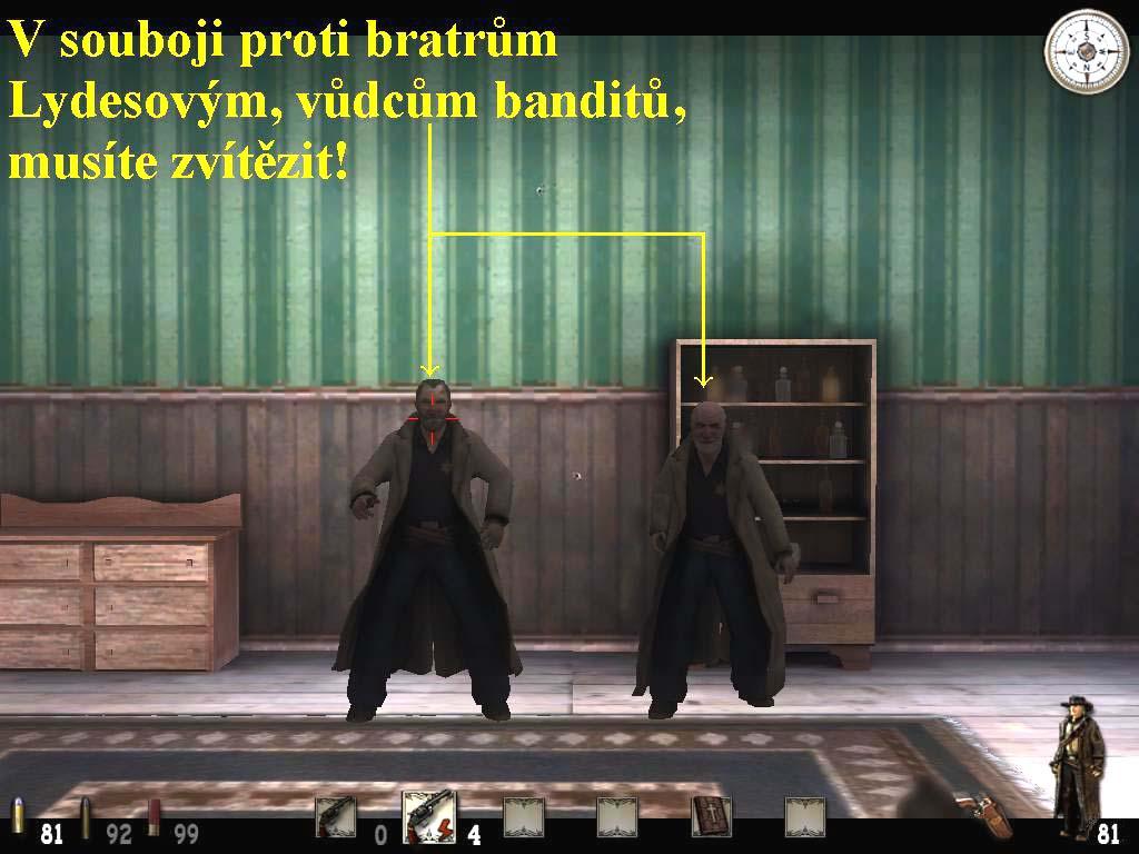 odmítnete. Vyzve vás tedy na souboj s pistolemi, dá vám ale pistoli s pouhými