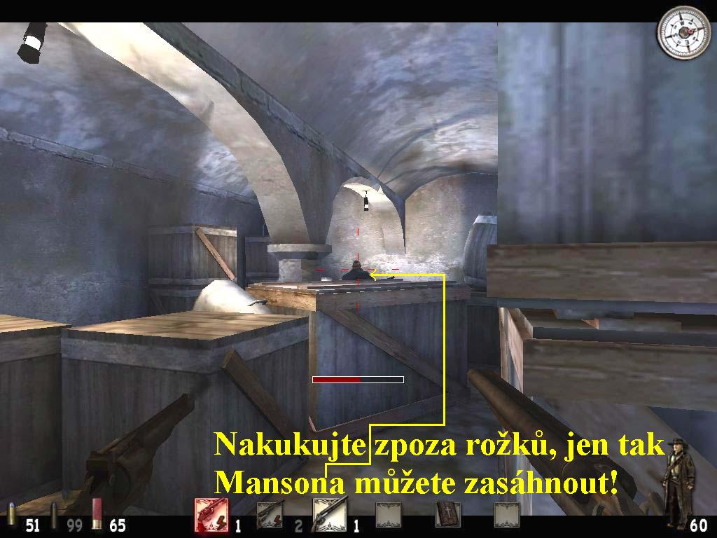 vlevo, vstupte do sklepa. Odbočte doleva, picněte banditu, za prvními dveřmi