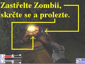Hned na začátku zlikvidujte několik nových bastardů, vpravo za rohem naleznete brýle TRINITY, které můžete používat pro tak zvané „noční vidění“, opět důkladně prohledejte celé okolí, všude se válí spousta užitečností, poté kolem nákladního auta jděte dozadu ke kontejnerům s odpadky, zezadu si na něj vyskočte, přeskočte na horní podestu před vámi (jde to ztuha, možná si pokus budete muset několikrát zopakovat) a z ní doprava na vlnitou plechovou střechu. Přeskákejte po ní až na okraj doleva, odtud přeskočte mírně doleva na další podestu, jděte po římse doleva a na konci vstupte do otvoru vpravo, kde ihned zabijte Zombii, seberte ji řeznický sekáček. Poté prohledejte místnost vpravo, picněte další obludu, v poslední místnosti odbočte doprava, jděte až k otvoru dole ve zdi, skrčte se a zastřelte bestii v druhé místnosti, pak dírou prolezte (obr.1). V místnosti se zbavte několika dalších příšer, posbírejte lékárničky a výzbroj, získáte nůž. Potom se otočte doleva, proskočte oknem na vlnitou plechovou střechu a ještě seshora pobijte všechny přízraky dole pod vámi a v okolních oknech (můžete si zapnou noční vidění „U“, abyste do oken lépe viděli). Poté seskočte dolů, zlikvidujte zbytek oblud. Vydejte se doprava k bednám na zemi, odstrčte je, spatříte otevřený kanál, jehož víko je odklopeno, seskočte si tedy do kanálu, vedoucího do odpadních stok.