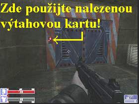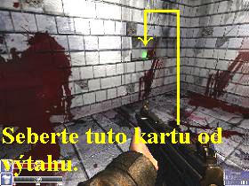 Ocitli jste se v půdních prostorách gangsterského doupěte, prohledejte tedy pečlivě celý půdní prostor kolem dokola, pak se dejte doprava a vlevo projděte vchodem. Znovu zabočte vpravo a na konci seskočte do otvoru v podlaze, tak se ocitnete v červeně nasvícené chodbě. Postupujte chodbou dopředu, otvírejte po obou stranách dveře, které samozřejmě otevřít lze, v místnostech potom likvidujte gangstery, nešetřete nikoho, ani ženy. Nemusím vám snad ani připomínat, že dříve než se vrátíte zpět na chodbu a budete pokračovat dál, každou místnost pořádně prohlédněte. V chodbě na konci otevřete předposlední dveře vpravo, tak se ocitnete na záchodcích, vlevo je pět kabinek, pobijte pobudy a vstupte do prostřední kabinky, kde projděte dveřmi a nastupte si do výtahu, který vás automaticky sveze níž, jakmile zastaví, vystupte si. Vyčistěte od gangsterů prostory před vámi, pokračujte doleva, prostřílejte si cestu až ke dvojdílným dveřím, ty však otevřete jen na kousíček, tudy tudíž dál neprojdete.Odbočte tedy do chodby s vězeňskými celami po obou stranách, pokračujte stále vpřed, vlevo i vpravo otevírejte kobky a likvidujte v nich vše živé i vězně, nadarmo zde nebručí a škoda jich není. Tak se dostanete až do místnosti na konci vpravo, kde postřílejte agenty, na konci u dveří seberte ze země paštiku, ale dveře opět jen pootevřete. Za vámi na pultu seberte zelenou vstupní kartu do výtahu, vracejte se zpět a prostřílejte si cestu až na úplný konec lomené chodby. Vlevo vložte do automatického spínače nalezenou kartu (obr.3), tak otevřete dveře, uvnitř zlikvidujte gangstery a pokračujte dál druhými dveřmi, za nimi v chodbě přistupte až k dalším dveřím a to je konec této části.