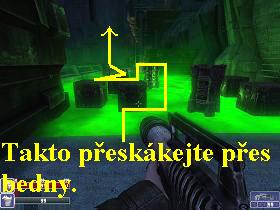 Vlevo u mrtvoly seberte raketomet, ten se vám bude tady rozhodně velmi hodit, popojděte vpřed a přeskákejte přes balvany, sejměte gaunera. Nyní musíte proskákat přes úzkou skalní štěrbinu před vámi, jde to sice ztuha, ale při trošce trpělivosti a šikovnosti se vám to určitě povede. Prohledejte tmavou chodbu vpravo, poté se vraťte, jděte dál dopředu a odbočte doleva. Pokračujte až nakonec, tam vstupte doleva do vchodu, zeleně nasvícenou místnost zbavte obejdů, vraťte se ven a vracejte se doprava až nakonec, postřílejte pár zlosynů a odbočte znovu doprava. Přejděte přes krátkou lávku, v místnosti pozor na létající monstra, tady využijte raketomet, jděte až na konec a po šikmé ploše vpravo, či vlevo vystoupejte výš. Prostřílejte si cestu dál, vraťte se k šikminám a nyní se vydejte po té prostřední, poté po další, pobijte monstra a vejděte doprava do místnosti, kde sejměte další otrapy, potom odbočte doprava k teleportu v podlaze, ten je ale nefunkční. Zelená kapalina na podlaze před vámi je prudce jedovatá, takže přejít na druhou stranu lze jen tak, že přeskáčete přes bedny, každý váš špatný přeskok má za následek vaše okamžité úmrtí (obr.4). Nastupte si do výtahu a nahoře si vystupte, jděte vpřed, odbočte na lávku vpravo, v modře nasvícené místnosti zlikvidujte monstra, vraťte se po lávce zpět až do místnosti, kde odbočte doprava. Přes protější dveře si prostřílejte cestu dopředu, pokračujte stále chodbou dál, chodby jsou plné gangsterů, takže buďte ve střehu. V modré místnosti odbočte doleva, o kousek dál vlevo si počkejte na výtahovou plošinku, která vás vyveze výš. Vystupte si, zbavte se banditů, jděte doleva, projděte přes dvoje dveře a opět si vlevo počkejte na další plošinku, jakmile přijede, naskočte si a nahoře vystupte. Odbočte doleva, na konci zabočte vpravo a prostřílejte si cestu dopředu. Pokračujte dál kruhovou chodbou, na pravé straně narazíte na poškozenou výtahovou plošinu, popojděte kousek dál, tady si naskočte na funkční plošinu, vyveze vás výš na rampu. Pokračujte po ní doleva, likvidujte bandity, nastupte si na další plošinu, vyjedete výš. I tady musíte skolit několik vyvrhelů, narazíte opět na výtahovou plošinu, nastupte a vyjedete až nahoru. Pokračujte doleva a prostřílejte si cestu až k prvnímu vchodu do skleněné kopule vpravo, místnost zbavte banditů, důkladně ji prohledejte a hlavně zkuste otevřít poškozené dveře, což nepůjde. Vraťte se zpět na rampu, vstupte do další místnosti vpravo a zde udělejte totéž. Vyjděte ven a dejte se doprava, vstupte do poslední místnosti vpravo, vejděte protějším vchodem do řídícího střediska, postřílejte několik darebáků a pak si stoupněte před řídící panel vlevo, klikněte na ENTER a tak si zprovozníte teleport v podlaze před řídícím pultem. Obejděte pult a vstupte do teleportu a zase jste se dostali o kousek dál.