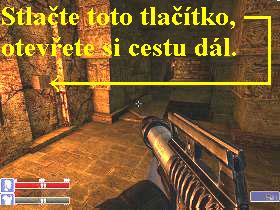 Vydejte se chodbou doleva, zabočte do další vpravo, obejděte svislý trám, prostřílejte si cestu vpřed, na první odbočce zabočte do chodby vlevo. Na jejím konci odbočte doprava, na první křižovatce chodeb znovu doprava, udělejte zde pořádek, vraťte se zpět až ke sloupu a vejděte do chodby vlevo. Pokračujte chodbou dopředu, na konci zabočte doleva (před tím ještě udělejte pořádek v prostorách vpravo), prostřílejte si cestu na konec chodby, nyní se ocitnete u propasti. Postřílejte všechny vojáky, jeden je naproti a druhý ve výklenku na konci vpravo, odtud seskočte dolů na kamenný kvádr, otečte se, přeskočte dolů na prkno a vejděte do chodby. V chodbě odbočte doleva a zabočte doprava k výtahu. Vpravo na zdi zatlačte na tlačítko, počkejte si, až přijede výtah (stůjte na místě, ať vás výtahová plošina nerozmačká na placku), nastupte si a vyjedete nahoru, kde si vystupte. Pokračujte chodbou vpřed, u sloupu picněte dva vojáky, vstupte do protější chodby, odbočte třikrát doleva a po šikmé ploše vystoupejte výš. Pokračujte stále vpřed, ocitnete se v místnosti, kde nepřehlédněte vlevo na zdi další tlačítko, tak si dole pod vámi otevřete cestu vpřed (obr. 8). Nyní ale přejděte po prknech na druhou stranu, pokračujte za neustálého likvidování vojáků stále vpřed, zde nelze zabloudit, tak dojdete až k bazénku s vodou, kde vystřílejte všechny vojáky. Tudy ale dál cesta nevede, takže se vraťte zpět až k prknům, přejděte přes ně a hned za nimi odbočte doleva a na konci zabočte vpravo do chodby. Postřílejte vojáky a v chodbě z druhého okna vlevo se sklouzněte dolů po šikmém kamenném bloku (lze se vydat také hledat dveře, které jste si před chvílí uvolnili, ale já volila tuto kratší, rychlejší a pohodlnější cestu) dolů. Prostřílejte si cestu chodbou doleva, tak dojdete až ke kruhové chodbě, v jednom z okének vlevo dole pod vámi je kamenný kvádr, na který seskočte a odtud na podlahu. Skolte velice nebezpečnou bestii, jděte ke zborceným kamenným sloupům, které přeskočte a seskočte do otvoru v podlaze. Tak se spustí animace, ve které budete zatčeni, odzbrojeni a uvrženi do kobky, po skončení této animace se skončí i tato část.