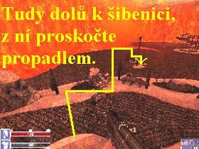 Nyní jste se tedy ocitli přímo v pekle, zde se nacházejí tři teleporty, kterými je nutno projít, abyste se dostali do další části. Musíte likvidovat létající pekelníky a nepřipustit si je k tělu, pokud vstoupíte tam, kam nemáte, budete vždy vráceni zpět na začátek, nebo za poslední teleport. Stojíte na jakési dřevěné, silně poškozené lávce, přeskákejte po ní dopředu, poté zabočte dvakrát doprava a vskočte si do lodičky, právě jste prošli prvním teleportem, ocitnete se tak na obrovském balvanu, musíte kolem sebe spatřit zlaté hvězdičky. Vlevo od vás spatříte šibenici, seskákejte dolů a jděte k ní, vylezte si na ni nahoru po žebříku a proskočte dolů propadlem (obr.10), prošli jste druhým teleportem, opět se musí kolem vás zlatě zajiskřit. Nyní spatříte před vámi velikou bránu, nad níž je nápis ARBAIT MACHT FRE, projděte jí, stále likvidujte bestie, odbočte doleva k zídce, od ní vpravo můžete sebrat cínového vojáčka (jeho použití vám načas zvýši vaši obranyschopnost), pak po schůdcích vystoupejte nahoru, jděte k oknu, skrčte se u něj a vyskočte, tak projdete posledním teleportem a tuto část ukončíte.