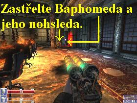 Spustí se delší animace, v níž si přečtete v „Knize osudů“ spousty novinek, dovíte se, kdo je to vlastně Baphomet, jaké má plány a záměry, najdete v ní i poslední varování pro vás a po skončení další animace se ocitnete přede dveřmi. Projděte jimi, po obou stranách jsou na skleněných krychlích různé užitečnosti, výkonné zbraně a spousty munice, vše posbírejte a projděte protějšími dveřmi. V animaci si promluvíte se samotným vládcem Pekla, Baphometem a vyzvete ho na poslední souboj, v reále se pak pusťte do boje. Je to protivník nebezpečný a odolný, ale naštěstí moc rozumu zřejmě nepobral, střílí po vás velice účinné ohnivé koule, stačí dva tři zásahy a jste bradou vzhůru (obr.11). Tomu lze ale předejít, jednak máte velice účinnou zbraň, jednak se dobře kryjte za sloupy a všude jinde, kde to jde, střílí nejenže v pravidelných intervalech, takže pokud budete co nejdál od něj, stačíte jeho střelám včas uhnout, ale pokud se schováte za sloup, klidně vystřelí taky a jeho vlastní odražená střela ublíží jemu, takže není problém s ním rychle skoncovat, pokud víte, jak na něj. Po jeho smrti se spustí závěrečná animace, opět se setkáte s vyšetřovatelem, kterému jste právě dovyprávěli celý příběh. Zjistíte, že jeho podobu jste již někde viděli, představí se vám jako Alan Draft a je zástupcem……… Ale to už vám neprozradím, přece vám pointu hry tady nevyslepičím, to překvapení si nenechejte ujít. A jak to všechno tedy skončí a co vás čeká? No tak na to se mě už raději vůbec neptejte…..