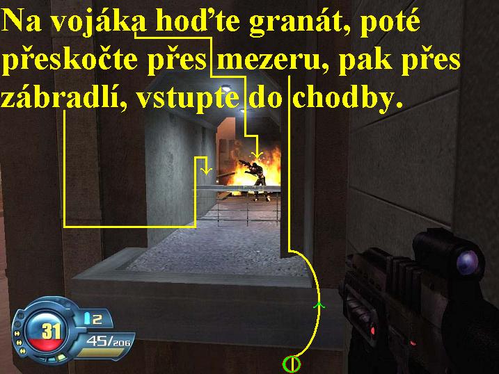 likvidujte vojáky. Na konci projděte dveřmi doleva, v chodbě zabočte