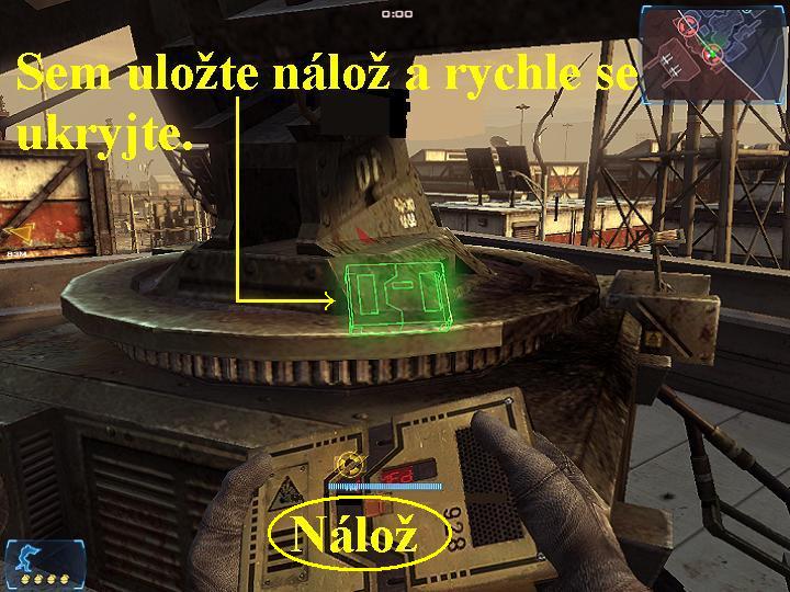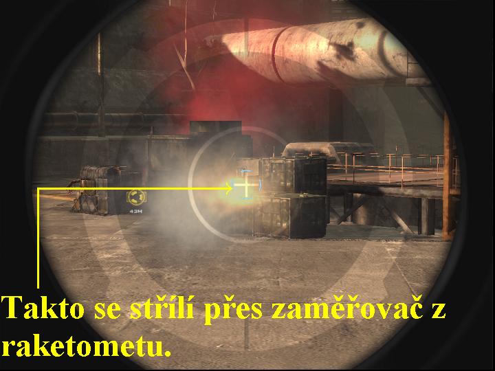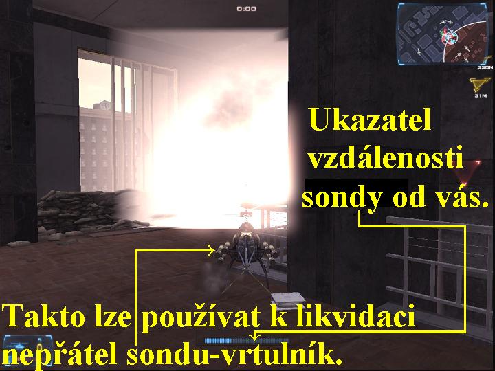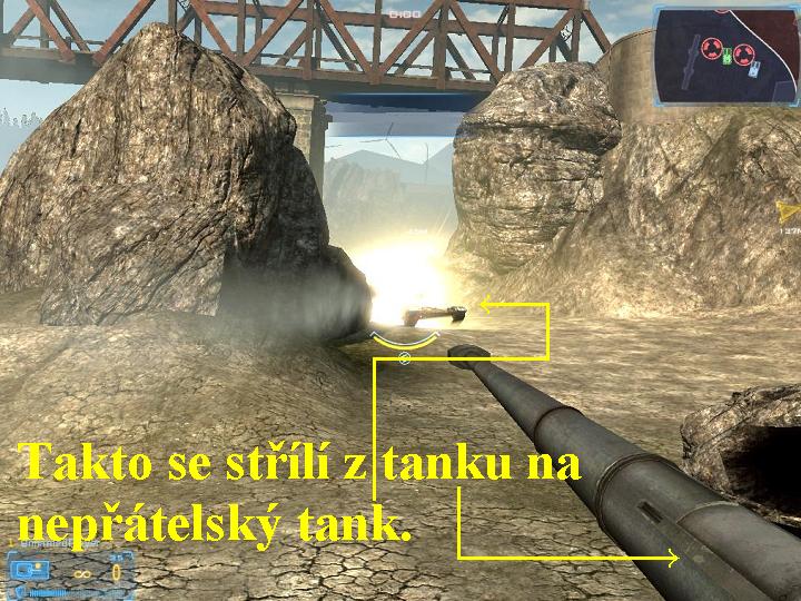 Jakmile skončí úvodní animace, v reálu se ocitnete v bojovém tanku a vaším úkolem bude likvidovat několik stanoviš, kde se nacházejí nepřátelské tanky, které musíte zlikvidovat. Jeďte tedy ve vašem tanku stále vpřed a postupně zlikvidujte tři vlny nepřátelských tanů, jejich polohy jsou opět označeny známými žlutými terčíky. Jakmile se přes tyto tři linie prostřílíte, obdržíte úkol zlikvidovat nepřátelské dělostřelectvo. Jakmile z tanku zlikvidujete po obou stranách dělostřelecké pozice, vystupte si z tanku a společně s kamarády se vydejte zničit dělostřelecké opevněné bunkry, jsou celkem tři. Všechny bunkry jsou ale chráněny nepřátelskou pěchotou a navíc je v každém i tank, na střechách všech bunkrů můžete potom nalézt i lepší zbraně a spousty munice. Polohy bunkrů jsou opět označeny žlutými značkami, takže víc vám tuto pasហpopisovat nebudu. Snad jen vám doporučím, abyste se nejdříve zbavili pěchoty a teprve potom z bazuky zničili i tank. Jakmile tedy všechny tři bunkry vyčistíte, vydejte se podle značek hledat palivový kontrolní systém, který je nyní nutno rovněž eliminovat. Nasedněte tudíž do jednoho ze dvou tanků, vyjeďte vpřed, u betonové zdi odbočte doleva a po chvíli doprava, popojeďte vpřed, ale budete muset si z tanku vystoupit, nebo prostor před vámi je chráněn silovým elektrickým polem, které železný tank nepustí dál. Jděte tedy vpřed pěšky, můžete sebrat i nové zbraně, také sondu-vrtulník, ale ani tato vám nebude nic platná, nebo je z kovu a její funkčnost eliminuje již mnou zmíněné elektrické pole. Vylezte tedy po prvním žebříku vpravo nahoru, seberte odstřelovačku a vyčistěte odtud okolí od nepřátelských vojáků, z bazuky pak zlikvidujte i automatické střelecké věžičky0000009195_n03.jpg (53604 bytes) (obr.3). Zde lze použít i pevně zabudovaný kulomet (E) a z něj likvidovat nepřátelské vojáky dole na nádvoří, sundejte ze sniperky i jednoho z několika zákeřníků z vysoké věže, jen pozor, střílí po vás z bazuky. Slezte dolů, jděte vpřed, doplňte si munici, vlevo vylezte na druhý žebřík, i zde lze použít pevně zabudovaný kulomet a vyčistit z něj okolí. Po žebříku vylezte na vysokou věž a tam zlikvidujte další záškodníky s bazukami, poté slezte dolů, pokračujte dopředu a na ovládací panel uložte nálož, odstupte si do bezpečné vzdálenosti, po chvíli nálož exploduje a panel zničí, zlikvidovali jste palivový kontrolní systém. Poté si nastupte do nově přistaveného tanku, vyjeďte v něm vpřed, z něj zlikvidujte nepřátelské tanky a z tankového kulometu (pravé tlačítko myši) i pěchotu. Po chvíli si s tanku vystupte, vylezte po několika železných žebřících až nahoru, postřílejte pěchotu. Slezte dolů a utíkejte vpřed před vrtulníkem, můžete se sice pokusit jej sestřelit, ale mnohem lepší je utíkat až na samý konec, kde vylezte opět po několika železných žebřících až nahoru, tam položte na rouru nálož a odstupte si, po nastávající detonaci tak ukončíte i tuto část.