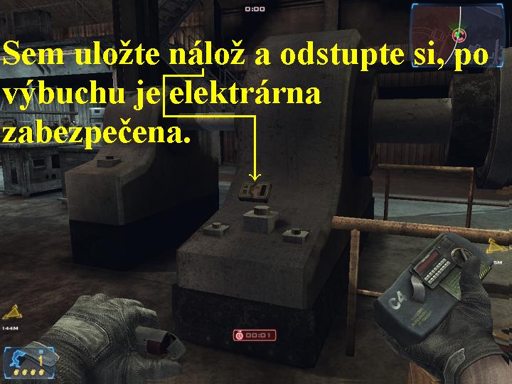 Po zhlédnutí úvodní animace a mapy se ocitnete společně s kamarády za ochranným valem, odkud sledujete nepřátelské pozice. Jakmile se ocitnete v reálu, nastupte si do vrtulníku a jakmile se roztočí jeho vrtule, vzneste se do vzduchu a lete vpřed, vrtulník se ovládá stejným způsobem, jako chůze, přepínat ale můžete pohled (C a V), vaším úkolem je zlikvidovat seskupení nepřátelských tanků. Pokud vás ale nepřátelé sestřelí, nic se neděje, můžete totiž používat vaše spojenecké tanky, ze kterých můžete pokračovat v likvidaci všech nepřátelských objektů. Kolem vás se ale nachází množství rozházených zbraní, neuškodí proto občas si vystoupit z tanku a posbírat je, přijdou vám vhod zejména tehdy, pokud bude tank, ve kterém jedete, zlikvidován. Nalézt se dá i zaměřovač cílů, takže můžete nepřátelskou techniku likvidovat i tím, že ji zaměříte a vaši spojenci dokončí vámi započaté dílo zkázy. Jakmile se vám podaří nepřátelské seskupení tanků totálně zlikvidovat, postupujte dopředu již pěšky, likvidujte nepřátelskou pěchotu, vaším dalším úkolem je vyčistit obě obranné věže. Vyběhněte tudíž po schodištích věže až nahoru, tam postřílejte vojáky, totéž udělejte i na druhé věži a máte splněny i tyto úkoly. Nyní musíte postupně zničit operační základnu a satelitní UPLIK, poté zabezpečit elektrárnu a vozový park. Ještě než opustíte druhou věž, seberte nahoře bazuku, z ní pak zlikvidujte zbylé nepřátelské tanky dole pod vámi, poté slezte dolů a vydejte se k satelitnímu UPLIKu, kde vylezte nahoru. Zde uložte nálož, odstupte do bezpečné vzdálenosti a po následující explozi jste tento satelit vyřadili z činnosti. Slezte dolů, nastupte si do nově přistaveného tanku, projeďte se v něm po nádvoří a zlikvidujte všechny nepřátelské cíle po celém okolí. Vysedněte u obranné věže, vstupte dovnitř a aktivací počítačového panelu tuto zabezpečte. Seberte protitankovou sondu, z ní zničte další nepřátelské tanky a vydejte se zabezpečit vozový park. Poté, co splníte i tento úkol, musíte ještě zabezpečit elektrárnu, nachází se na druhé straně u stožáru s vysokým napětím. Zde uložte nálož a opět odstupte, po následujícím výbuchu jste zabezpečili i tuto elektrárnu. Teď se tedy vydejte zabezpečit vstup do základny. Vyjděte ven mezerou mezi zdmi, postřílejte vojáky před vámi, poté vstupte do tunelu. Zlikvidujte další vojáky a zničte obě automatické střelecké věžičky, postupujte vpřed, soustavně likvidujte další vojáky, vstupte do chodby vpravo. Zde aktivujte panel na zdi, otevřeli jste si bránu pro další pokračování v cestě. Vrate se do hlavní chodby, postupujte vpřed, po novém nahrání hry budete muset zničit východní i západní generátor. Vlevo postřílejte nepřátelské pěšáky, před vámi posbírejte nové razantnější zbraně, vlevo před vámi za otevřenými vraty pak zničte tank. Pokračujte vpřed, likvidujte pěšáky, najdete nové zbraně a dokonce i loveckou sondu. Zlikvidujte další střelecké věžičky, poté položte postupně nálože na oba generátory, teď jste definitivně zlikvidovali celou elektrárnu0000009195_n04.jpg (67430 bytes) (obr.4). Po explozi přeběhněte přes místnost na druhou stranu na kulatou plošinku a odtud si prostřílejte cestu po několika schodištích až dolů. Vstupte do červeně nasvícené místnosti, zde aktivujte panel, obsadili jste tak kontrolní místnost. Přejděte chodbou do druhé místnosti, opět postřílejte několik vojáků, vstupte do modře nasvícené chodby a proveďte aktivaci akce (E), splnili jste další úkol. Nyní musíte přerušit startovací sekvenci, vstupte tedy do chodby s bleděmodrou prosvícenou podlahou, prostřílejte si cestu až na její konec. Poté si prostřílejte cestu po všech schodištích až úplně nahoru, kde aktivujte panel, tak jste zastavili startovací frekvenci a tak zároveň splnili všechny úkoly této mise.