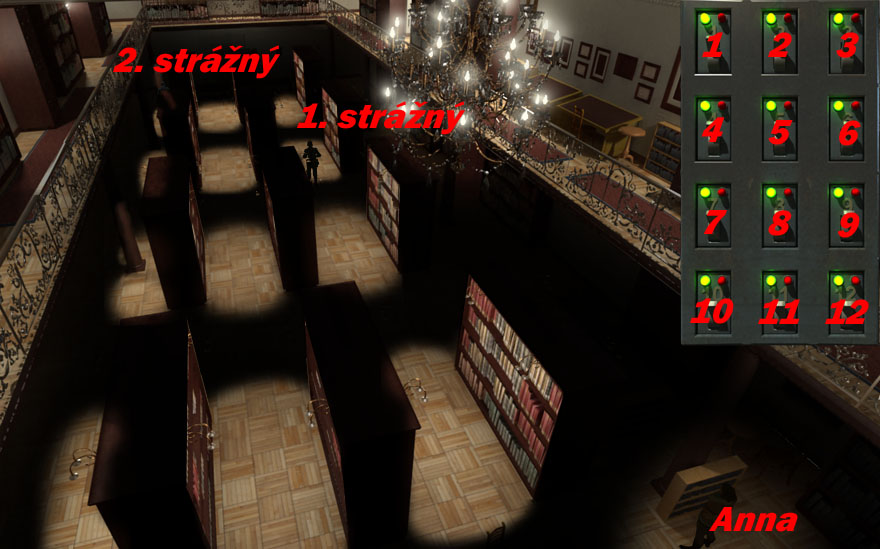 Anna nyní stojí poblíž světla 12. Pokud nějak špatně přepnete světlo nebo si to nějak špatně načasujete, Anna je chycena a začínáte znova od začátku u světla 12. Asi nejrychlejší cestou jsou postupně světla 12, 9, 6, 5 a 2. Jakmile začnete, vypněte světlo 12 a počkejte, než strážný před vámi odbočí doprava. Světlo 12 zapněte a vypněte světlo 9. Až se druhý strážný bude blížit na konec uličky (blíže k vám) zapněte světlo 9 a rychle vypněte světlo 6. Mezitím pomalu přejde první strážný za vás a vy rychle vypněte světlo 6 a zapněte světlo 5 dříve, než se první strážný otočí. Poté rychle vypněte světlo 5 a nakonec zapněte světlo číslo 2. Bohužel se nedá v mini-hře ukládat, takže vám to musí vyjít najednou. Po chvíli si zapamatuje, jak strážní hlídkují a nemělo by vám dělat problém mezi nimi projít. U světla 2 uvidíte, že potřebuje kód, abyste se dostali do speciálního archivu. Musíte se tedy nyní vrátit a opět za pomocí světel. Ujistěte se, zda-li jsou zapnuta všechna světla a vypněte světlo 5. Počkejte, až se druhý strážný otočí a odbočí doleva. V tu chvíli zapněte 5 a vypněte světlo 8. Jakmile první strážný odejde dostatečně daleko, zapněte 8 a vypněte světlo 9. A pak jen ve správnou chvíli zapněte 9 a vypněte opět 12. Anna vyjde nahoru za vámi a vysvětlí, že potřebuje kód, který by u sebe mohl mít některý ze strážných. Je tedy potřeba se obou strážných zbavit. Sejděte po schodech vpravo nahoře dolů a u pravé knihovny si všimněte u země kruhů. K tomuto kruhu připevněte telefonní šňůru a spojíte ji s druhým kruhem naproti knihovny. Ze stolu vpravo seberte německou vlajku a jděte si stoupnout mezi knihovny nahoru. Dostanete se tam pomocí tmavého bodu na podlaze. Tady zkombinujte v inventáři leštící prostředek s německou vlajkou a výsledek umístěte na tmavý bod na podlaze. John naláká oba strážné k němu a postupně se jich zbaví. Jeden z nich uklouzne a druhý zakopne o drát a praští se o stůl. Prohledejte strážného v bezvědomí, který se praštil o stůl, a najdete deník s čísly 493. Jděte nahoru ke dveřím do speciálního kabinetu a vpravo od dveří odhalte skrytý panel. Poté se na něj podívejte a zadejte čísla ze strážcova deníku.