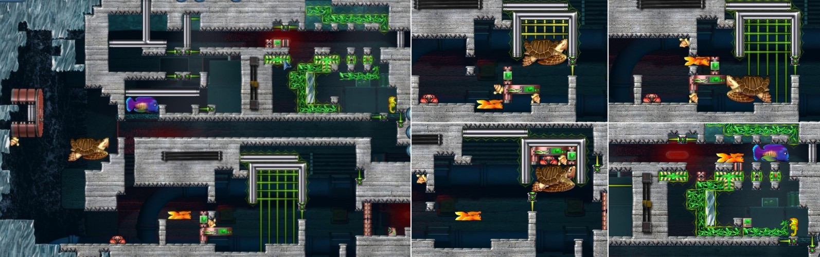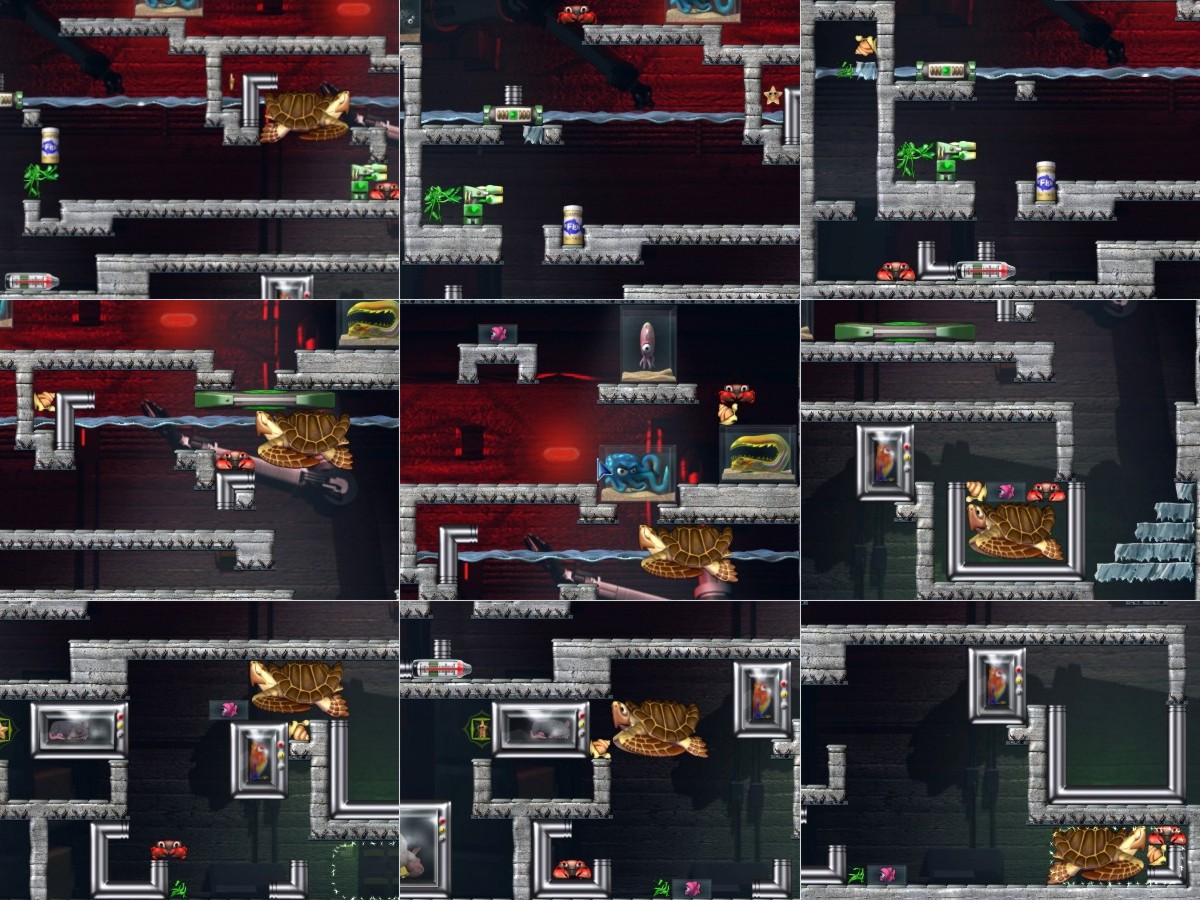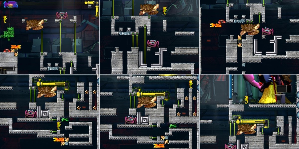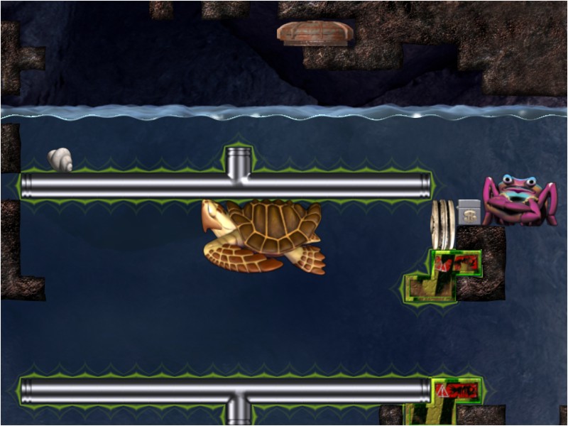 Želvu a ta zapluje do trubek a přenese je doprava (4). Zde se spustí dolu a