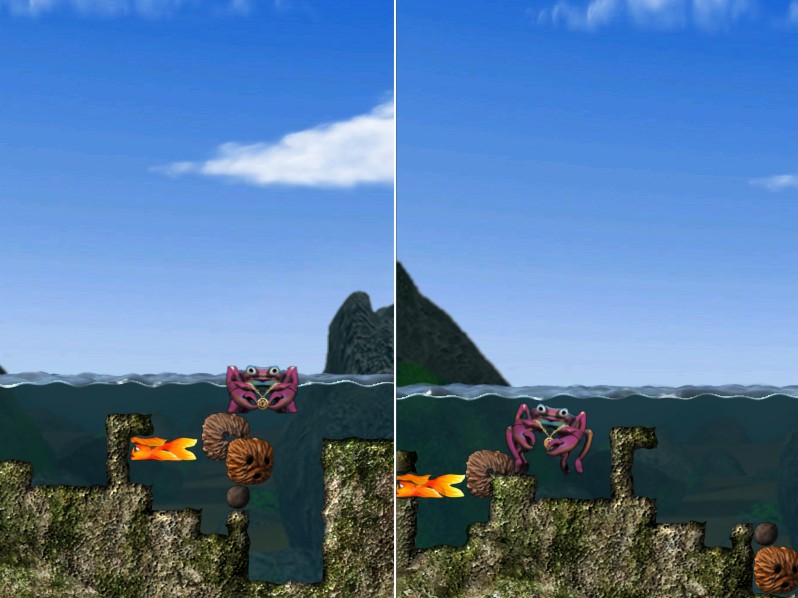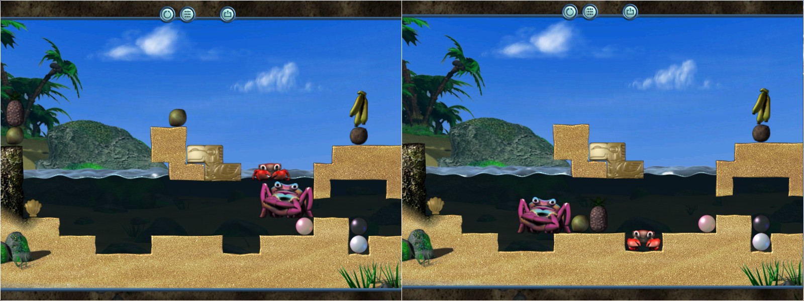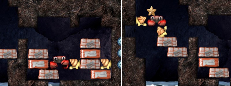 krab vyleze doleva nahoru. Pak Tinou posuňte led doprava a poté co vypluje