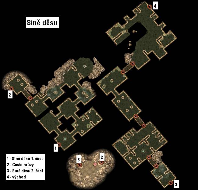 sestupujete klikatým schodištěm. Hned po pár krocích se zastavte u ducha