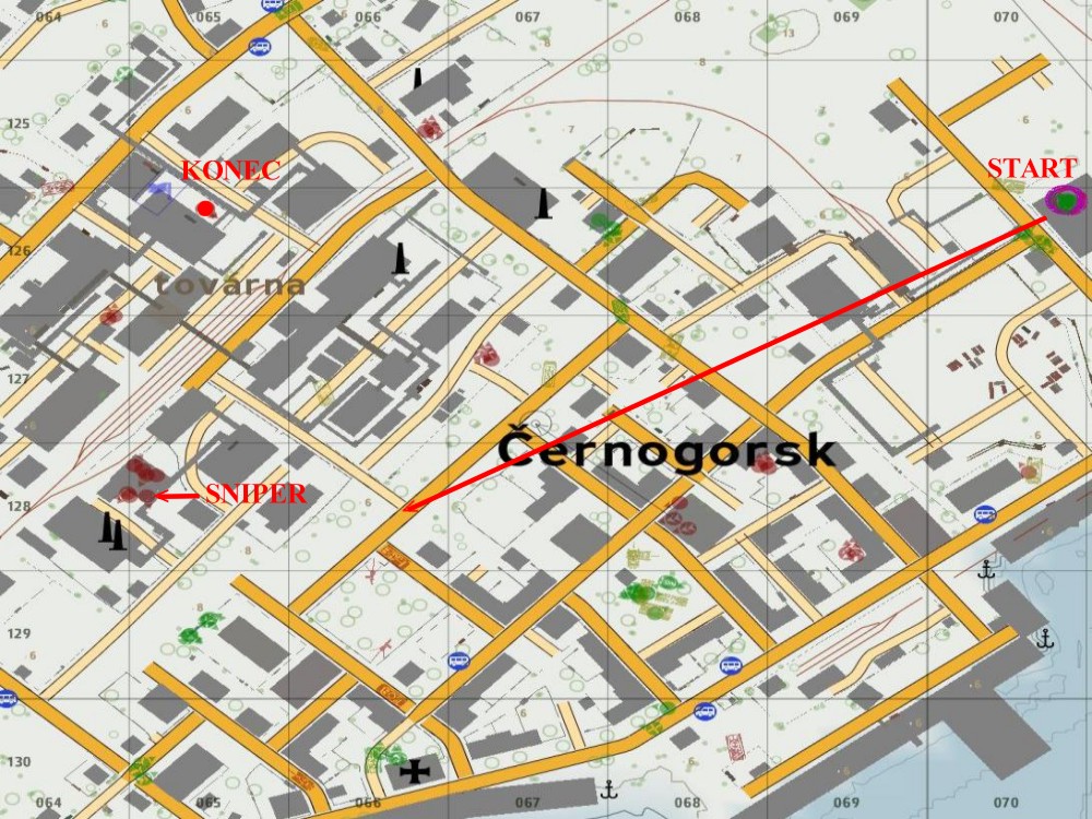 snipera, ten leží na střeše (065,128). Po jeho eliminování postupujte podle