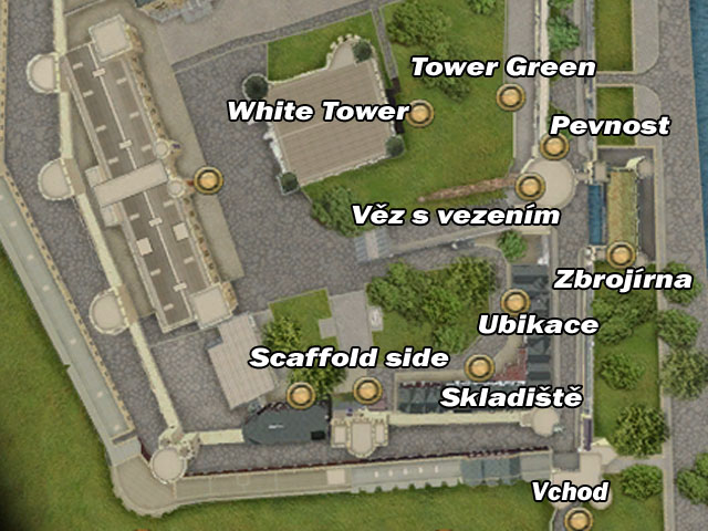 (Tower Green), otočte se a projděte průchodem. Vpravo si všimněte lana, na