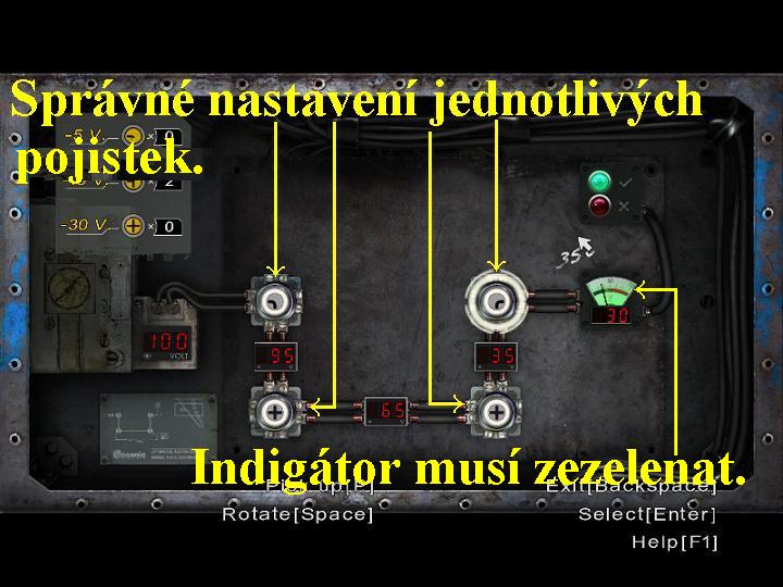 Sejděte po schodišti až dolů do chodby a jděte k protějším dveřím, kterými projděte. Ocitli jste se v prostorách, osvětlených jen červenými nouzovými světly. Popojděte vpřed, vpravo za drátěným pletivem spatříte známou pojistkovou skříňku, k té se tedy budete muset nyní dostat. Procházejte tedy nejdříve všemi místnostmi a sbírejte co nejvíce pojistek, hlavně potom těch, označené jako "elka", těch potřebujete nejvíce. V jedné z místností naleznete i lampu, pokud ji ještě nemáte, seberte ji, pokud jste dali na moji radu a od Juliet směnili vše za kanystry, máte nyní paliva do lampy dost a můžete už procházet dalšími místnostmi a svítit si lampou. Jakmile vše posbíráte, vraťte se ke dveřím, kterými jste vstoupili dovnitř, otočte se a jděte chodbou vpřed. Dveří vpravo si nevšímejte, dojděte až na konec druhé chodby, kde odbočte doprava, zaslechnete nějaký tajemný hlas, který někomu vyhrožuje, že mu "vystřelí i druhé oko". Poté vstupte do druhých dveří, projděte dál přes ložnici, pokračujte znovu doprava, poté znovu do chodby vpravo, pokračujte vpřed a držte se při pravé zdi, tak dojdete ke schodišti, vedoucímu doleva dolů, tam ale nechoďte. Kousek od něj vpravo dál vede úzká chodba vlevo, vstupte do ní, tak dorazíte až ke skříni s pojistkami. Nyní můžete lampu zhasnout, neboť do pojistkové skříňky budete dobře vidět i beze světla, šetřete tedy palivem. Otevřete tedy skříňku a do horní řady zleva doprava vložte pojistky takto: "elko", "elko" a "elko", do prostřední opět zleva doprava "elko", "elko" a "elko", do dolní potom znovu zleva doprava "elko", "elko" a "téčko" (upozorňovala jsem vás celou dobu, že budete potřebovat hodně pojistek, označených jako "elko"). Nyní budete muset ještě pojistky přetočit tak, abyste pospojovali jednotlivé obvody. Pokud nevíte jak, klikněte na F1, pakliže tomu ještě nerozumíte, lépe než další popisování vám poslouží další můj obrázek0000010410_n07.jpg (89760 bytes) (obr.7). Poté co vše správně nastavíte a propojíte tak všechny obvody, ampérmetry se musejí rozsvítit zeleně, spatříte, jak se vpravo od vás otevřeli dveře, projděte jimi a vylezte nahoru po žebříku, tak se ocitnete se v horních místnostech Flame Station.