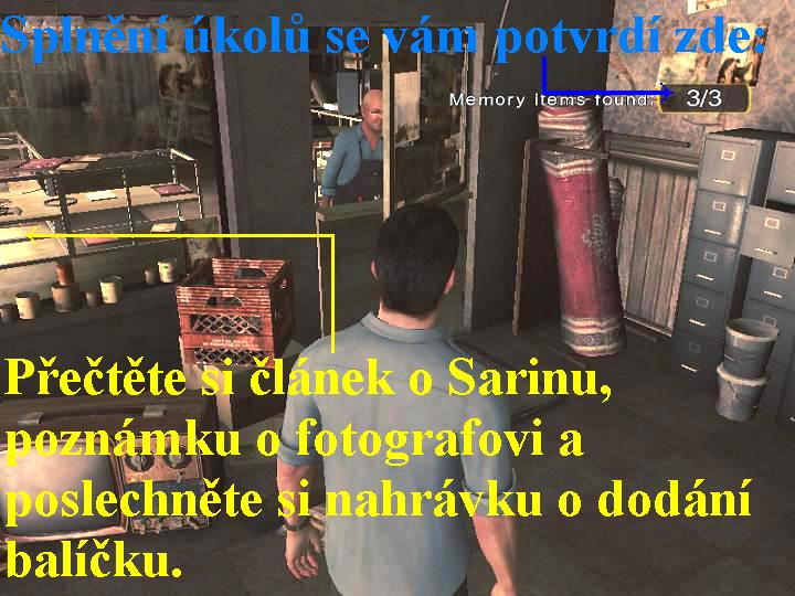 Ocitli jste se v předsíňce jakési zastavárny, v její zadní části vidíte přes sklo muže stojícího za pokladnou a taktéž i dívku, která vás už pronásleduje téměř od samého počátku příběhu, vidíte ji, jak přichází k pokladně. Nyní musíte známým způsobem opět udělat fotku a to tak, aby na ní bylo vidět obě mnou popisované osoby při jejich rozhovoru a zároveň byla na ní i tabule, na níž si nad nimi můžete přečíst nápis RICO SHOP. Po vyfocení uvidíte scénku,ze které se dozvíte,že dívka se jmenuje Lisa Geilhorn a po Ricovi chce nějaké informace. Počkejte tedy, až odejde, tak k vám vjede na vozíčku upoutaný Locke a Rico je k vám otočený zády. Dříve ale, než se rozhodnete s ním promluvit, prohlédněte si na stole poznámku o fotografovi, vyslechněte si nahrávku o doručení balíčku a nalevo od stolu si přečtěte článek o Sarinu0000010410_n03.jpg (91115 bytes) (obr.3). Teprve nyní si promluvte s Ricem, tak se od něj dozvíte, že jak vy, tak i Lisa Geilhorn sháníte informace o chlapíkovi jménem Savo, tímto tento flashback skončí. A vy se opět ocitnete na pláži. Nyní již tedy víte, že Locke v minulosti se mohl pohybovat pouze na invalidním vozíku, jděte tedy k němu, proberte všechny dialogy a hlavně se mu zmiňte o tom, že víte o jeho minulosti, kdy se nemohl bez vozíku pohybovat. Tak váš rozhovor rychle přeruší, zřejmě na to moc pyšný není a přislíbí vám, že vám baterie dá, odběhne a vy ho následujte údajně do skladiště. Jakmile ho doběhnete, opět si s ním pohovořte, proberte s ním všechny nabídky dialogů, tak vám sdělí, že na další cestu máte na stromech značky, podle kterých se musíte orientovat, sám ale s vámi nepůjde, počká prý na vás až na samém konci cesty. Jakmile tedy popojdete vpřed, první na koho narazíte je Korejec, s ním se domluvit je ale stejné, jako s nějakým „Hotentotem“, takže to ani nezkoušejte, vlevo od něj je na stromě první značka, tedy šipka. Jakmile na ni kliknete, ukáže se vám další směr postupu, vydejte se tudíž ukázaným vám směrem, stejným způsobem postupujte vpřed kolem dalších značek. Za třetí značkou po vás začne ale nějaký padouch střílet, vezměte tudíž „nohy na ramena“ (levý Shift+klávesa vpřed), utíkejte za neustálého kličkování vpřed, narazíte na tyčky s červenými praporky, které mají stejný účel, jako předcházející šipky na stromech, kolem nich doběhnete až do další lokace. Zde už na vás čeká Locke u podivného poklopu, vedoucího dolů do země. Prohlédněte si tento poklop, odhalíte tak další Lockeho tajemství, zjistíte jaká jsou jeho „prokletá čísla“, tedy 4, 8, 15, 16, 23 a 42, můžete si je i vyfotit. Posbírejte okolo všechny ořechy i láhev s vodou, ať máte s čím obchodovat, znovu si promluvte s Lockem, nyní po vás chce, abyste prošli tmavou jeskyní a protože prý jeskyni zná, chce po vás, abyste jí prošli sami, počká prý na vás na jejím druhém konci. No to už je ale skutečně ke vzteku, ale nic s tím samozřejmě nenaděláte. Jestliže už u sebe nemáte žádné pochodně, můžete si je u Lockeho směnit za předměty ve vašem inventáři, takže pak vezměte louč do ruky a vstupte do jeskyně. Poté co do ní vstoupíte, zjeví se duch a Lisu spatříte v chodbě před vámi, jakmile však k ní popojdete, tato zmizí v další části jeskyně. Zapalte tudíž louč a následujte ji, z veliké dálky pak uslyšíte její úpěnlivé volání, kde zjišťuje kde jste a vyzývá vás k následování. Během cesty přes jeskyni se řádně rozhlížejte, můžete najít krabici s jídlem, kterou je vhodné sebrat, má velikou peněžní hodnotu, také lze najít i další pochodně. Další cesta je ale hodně zapeklitá a obtížná, musíte se vyhýbat propastem v zemi a dávat pozor, aby vám pochodeň neuhasili další pitomí netopýři, po chvíli však dorazíte do světlejší části propasti a spatříte konečně Lisu, jak mizí za vodopádem. Nyní ji musíte následovat skrz vodopád, pokud si svítíte loučí, tato vám zhasne, takže ji znovu rychle rozsviťte, na křižovatce odbočte na cestu doleva a pokračujte dál až k druhému světlému místu s vodopádem, šetřete pochodní a zhasněte ji. Pokračujte skrze vodopád, přejděte opatrně dál přes úzký kamenný můstek, jděte stále vpřed a dorazíte znovu až k Lise. Seběhněte za ní dolů a pokecejte s ní, odpoví vám něco jako „co se to vlastně děje?“, do toho naskočí animace, kde ji spatříte s prostřelenou hlavou a poté ji ztratíte z dohledu. Nezbývá vám tudíž nic jiného, než opatrně seskočit z útesu dolů, neboť jiná cesta dál prostě nevede, natlučete si sice pořádně nos, ale přežijete to. Vydejte se vpřed, po vaší pravé straně se objeví kostlivec, třímající v rukách kompas, tento kompas mu seberte a tak se nahoře nad vámi objeví Locke. Budete po něm chtít, aby vám nějakým způsobem pomohl dostat se nahoru, klade si však podmínku, chce vědět, co jste po cestě viděli a našli. Z hlubin jeskyně počne vylézat strašlivé monstrum, Locke chce vámi nalezený kompas vidět, no na dlouhé debaty není čas, takže mu raději rychle vyhovte a kompas mu hoďte, tak vám sdělí, že je na něm nápis „Via Domus“, tedy „Cesta domů“ a poté vás konečně laskavě vytáhne k sobě nahoru.