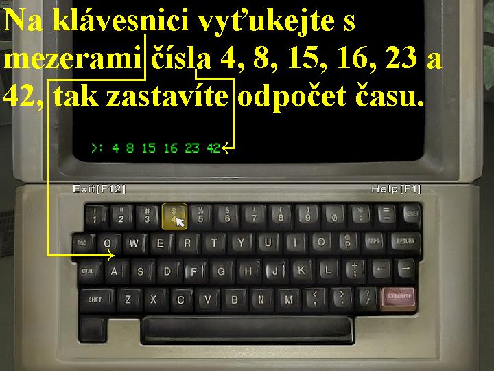 Ocitli jste se podruhé v Ricově zastavárně, nyní máte za úkol udělat fotografii snímku, ležícího na pultě před Ricem. Ten ale občas přikrývá snímek rukou, musíte tedy najít vhodnou chvíli, kdy ruce z fotky zvedne, pak zvolit vhodnou vzdálenost a správně zaostřit0000010410_n04.jpg (53087 bytes) (obr.4). Poté co se vám podaří snímek udělat, prohlédněte si ho a potom v reále si prohlédněte i jeho složku na pultě, s Ricem ještě nehovořte, objeví se vám ukazatel 1/3, takže ještě si musíte najít dva aktivní předměty. Vydejte se doprava mezi regály, vpravo na zemi spusťte přehrávač a vyslechněte si nahrávku 2/3, za regálem si potom přečtěte dopis 3/3, nyní se můžete vrátit k Ricovi a pohovořit s ním. Dozvíte se od něj, že Savo má schůzku v Hotelu Persephone v pokoji číslo 42, ale do zastavárny vtrhne rozkacená Lisa a dostanete pěstí do zubů, bude se rozčilovat že jí fušujete do jejího případu. Jedno však získáte, ve vzteku si nevidí do huby a prohlásí "You are a son of a bitch, Elliot Maslow". Sice vás nazvala "čubčím synem, ale zato již nyní znáte vaše jméno, jmenujete se tedy Elliot Maslow. Po skončení této animace se ocitnete znovu zpět na pláži. Zde si promluvte s Hurleyem, který právě dokončuje jeho příběh, ve kterém se mimo jiné zmiňuje o tom, jak se mu dostalo jeho přezdívky Hurley. Proberte s ním všechny možnosti rozhovorů, hlavně mu sdělte, jak se jmenujete, což tlouštíka velice potěší a je rozhodnutý svůj příběh vyprávět všem častěji. Svoje jméno můžete sdělit i ostatním přítomným na pláži, nejvíce zklamete Katy, která si doposud myslela, že se jmenujete Nick. Nyní se vydejte po známé cestičce do lesa, po chvíli se vám ukáže nabídka jít k poklopu, využijte ji, aťsi nemusíte znovu trmácet přes džungli. U poklopu jsou další láhve, ořechy a tyčinka Apollo, ta posledně jmenovaná je vzácná, její cena je 50 dolarů, vše poberte. Poté se vydejte k řece, odbočte k bunkru a jděte si promluvit se Sayidem. Tomu sdělte vaše jméno, zkontroluje si ho podle seznamu pasažérů a dovolí vám vstoupit do bunkru, projděte tedy dveřmi dovnitř a sestoupejte dolů po schodišti, vejděte do chodby. Spustí se animace,  v níž Sayid zpanikaří a uteče, prý pro pomoc za ostatními, ještě vás ale stačí upozornit na to, že pokud zaslechnete pípání, počne běžet čas, do jehož uplynutí musíte stačit zadat do počítače prokletá čísla, čímž odpočítávání zastavíte, pokud se vám to včas nepodaří, vše kolem vás vybuchne a máte "po žížalkách". Je tedy jasné, že jakmile zaslechnete zmíněné pípání, nejdříve se musíte dostat k počítači a deaktivovat na něm odpočítávání času, abyste získali dost času na plnění dalších úkolů. Pokud tedy ještě odpočet nenastal, můžete prohledat všechny místnosti a posbírat všechny pojistky, budete jich potřebovat mnoho a jsou rozházeny po všech prostorách, nejvíce jich je v malém skladišti, kde můžete posbírat i mnoho nápojů a potravin. Porozhlédněte se také po panelech s pojistkami, jsou tři a všechny budete muset aktivovat pomocí správného uložení a navíc i nastavení pojistek. Už slyšíte pípot a odpočet času byl zahájen? Takže honem jděte k počítači, aktivujte ho, nad dveřmi vidíte ubíhající čas, nemáte tedy na vše více času, než necelé tři minuty. Ještě si předem všimněte toho, že vlevo od počítače jsou na panelu tři nesvítící světla a neaktivní páka, je tedy zřejmé, že tato světla se musí rozsvítit, abyste mohli aktivovat páku a přehodit ji. Po aktivaci počítače se vám objeví klávesnice, na které vyťukejte ve správném pořadí vám již dobře známá "prokletá čísla", mezi každým musí být mezera. Napište tedy zprava doleva 4, 8,15,16, 23 a 42 a potvrďte to dole vpravo červenou klávesou "EXECUTI", tak odpočítávání času sice zcela nezastavíte, ale prodloužíte ho na 120 minut a v této době již všechny další potřebné úkony lehce zvládnete0000010410_n05.jpg (72968 bytes) (obr.5). Pokud tedy máte posbírané všechny pojistky, můžete zahájit celou akci. Vydejte se tedy k pojistkovému panelu, umístěnému na zdi v chodbě, aktivujte ho a vkládejte do něj pojistky tak, že v horní řadě zleva doprava vložíte pojistku označenou jakýmsi zkrouceným znakem (připomíná "elko", poté se znakem T, opět zkroucený znak a ještě jednou tentýž,  do prostřední řady vložte opět zleva doprava pojistku se znakem kříže, poté T, opět T, do dolní pak zleva doprava pojistku s křížem, vpravo od ní pojistku se zkrouceným znakem, dále tu stejnou a nakonec s T-éčkem. Nyní musíte pomocí mezerníku každou pojistku kromě těch s křížem natočit tak, aby se vám aktivovaly všechny ampérmetry na každém řádku. Pokud jste to provedli správně, na panelu s pákou vlevo od počítače se vám rozsvítilo první zelené světélko, takže vám ještě zbývá nastavit dva zbývající panely. Vpravo od nyní již vámi zaktivovaného panelu se nacházejí zazděné dveře, přičemž kompas ukazuje na ně, takže se tam musíte nějak dostat. Po pravé straně pří vstupu do obývací místnosti je na zdi barevná kresba s čísly, můžete si ji vyfotografovat, tak získáte další bonus. Druhý panel najdete v obývací části mezi lékárničkou (vyfotografujte pro získání dalšího bonusu) a oblekem, na kterém se nachází  jméno Kevin, i tento si vyfoťte pro získání bonusu. Aktivujte i tento panel a pojistky do panelu vkládejte tak, že do horní řady zleva doprava vložte pojistku s křížem, poté T, značku zatáčky ("elko"), prostřední řada T, dolní řada pak kříž, volno a značka zatáčky. Poté opět otáčejte pojistkami tak, aby se rozsvítily vše