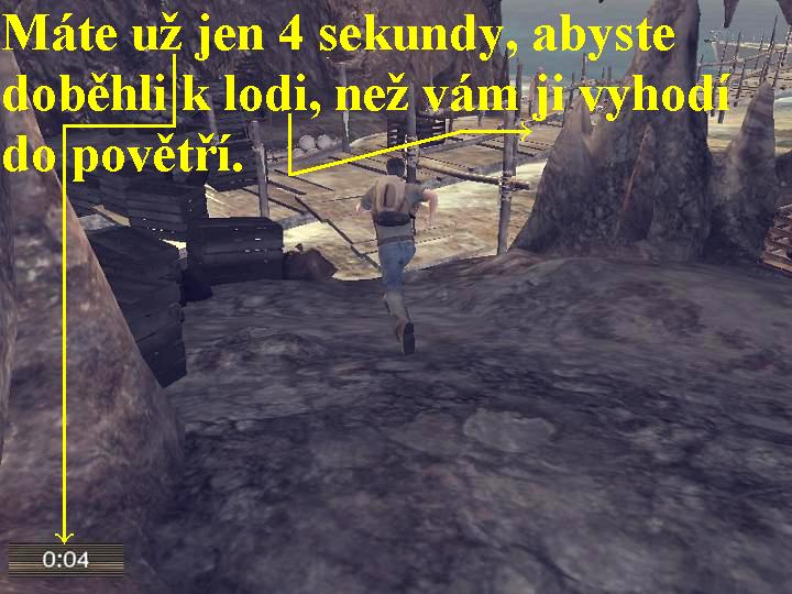 0000010410_n08.jpg (80590 bytes)Najde vás však Juliet, probere vás fackami, dostanete od ní zpět váš fotoaparát a poradí vám, že budete muset jako blesk doběhnout k vaší lodi, kde na vás bude čekat Locke. Jakmile se tedy ocitnete v reále, vezměte nohy na ramena a utíkejte vpřed, seč vám síly stačí. Podobný závod s časem jste už jste jednou absolvovali, když jste "zdrhali" před tmavým mrakem, takže zkušenosti již máte. Tentokráte to bude o to horší, že kromě již známých překážek, které musíte přeskakovat, nebo podlézat, po vás na vaši strastiplné cestě budou ještě navíc střílet "Ti druzí". Udržujte tedy kurz 325 stupňů a vypněte se k tomu nejlepšímu překážkovému běžeckému výkonu, tady je časový limit skutečně našponovaný. Máte pouhou minutu a třicet sekund na to, abyste se přes všechny překážky dostali co nejdále, neboť po chvíli, zhruba asi v polovině cesty z animace zjistíte, že k vaší lodi připlouvá loď "Těch druhých", kteří chtějí vaši loď zlikvidovat. Pokud to tudíž nestihnete včas, hodí na vaši loď jeden bídák molotovovu láhev, tak ji zapálí a skončili jste. Poté co přeskočíte řeku a zahnete doleva do skalního tunelu, zbývá vám už jen několik posledních sekund (obr.8), tak přece to teď nevzdáte. Jakmile doběhnete až na kraj tunelu, odbočte doprava na přístavní molo, zde už vás očekává Locke, který zastřelí v poslední chvíli kormidelníka "Těch druhých" a jejich loď tak vybuchne a shoří. Pohovořte si s Lockem, poté se sním rozlučte, jděte k vaší lodi a nastupte si. Spustí se animace, v níž se na nebi objeví letoun, sledujte jak vybuchne a rozlomí se na několik kusů a jeho trosky počnou padat k zemi. Probíráte se z bezvědomí, jste na ostrově, kde vládne zmatek a spatříte, jak k vám běží i když zraněná, přece jenom živá Lisa, která je štěstím zcela bez sebe, že jste havárii letadla letu 815 taktéž přežili. No takže jste pochopili, že jste pořád na ostrově, ale máte u sebe alespoň Lisu, co tedy chcete víc? Už nic chtít nemůžete, zřejmě jste se "pinožili" celou dobu zbytečně, neboť na vás už čekají pouze tolik známé závěrečné titulky.