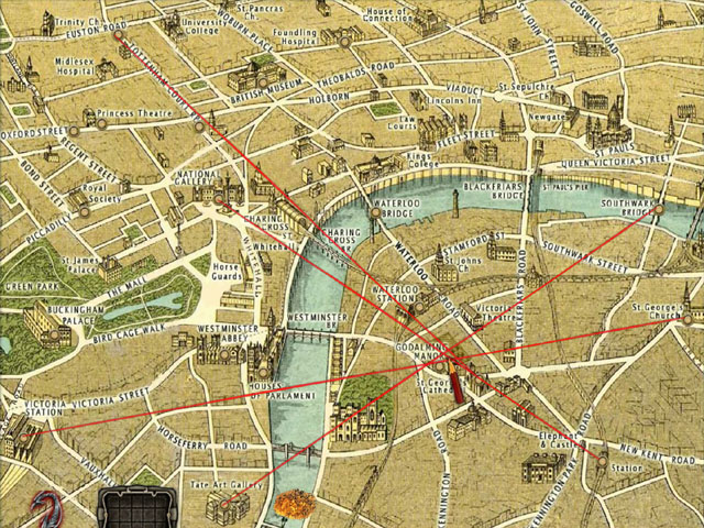 0000010414_n01.jpg (178013 bytes)Po přečtení dopisu a novinového článku se octnete v bytě Miny, v Londýně. Mina vám zatím moc neřekne, protože je trochu roztřesená ze smrti sestry služebné. Proto jí ještě tu smutnou zprávu neoznámíte. V pokoji vezměte z křesla vpravo noviny a také seberte noviny vlevo na stole. Oba novinové články si přečtěte a opět se v nich pojednává o smrti lidí, kteří mají na krku kousnutí. Na stole se ještě podívejte na hromádku novin a vytáhněte noviny News Times z 6. září 1898. Z článku se dozvíte, že Ethel Basingstroke naštěstí unikla před mužem v černém, který ji sledoval. Ze stolu si ještě vezměte fotografii Jonathana a jděte dolů. Odhalte závěsy a spatříte detailní Harkerovu mapu Londýna. Na základě míst z novin uchopte dole červenou tužku a spojte následující místa. Stanici poblíž New Ken Road vpravo dole spojte s Národní Galerií. Pak spojte Southwark Bridge vpravo s Tate Art Gallery dole. Vlevo nahoře pak spojte Euston Road s Katedrálou Svatého George (St. George’s Cathedral). Nakonec spojte Kostel Svatého George vpravo s Victoria Station a klikněte na místo, kde se čáry protnuly - Godalming Manor a vedle je hřbitov Bloomsbury. Poté se do pokoje vrátí Mina a Van Helsing ji požádá, aby na okno pověsila česnek a nikoho nepouštěla dovnitř.