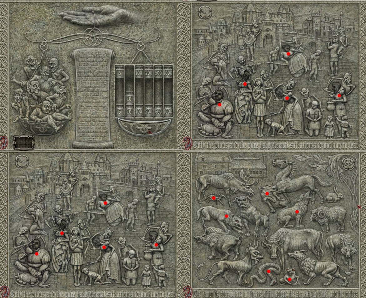 Běžte tedy zpět doprava, opět doprava a sejděte dolů po schodech. Jděte opět nahoru ke schodům a vlevo si všimněte mauzolea hlídače. Podívejte se na mříž, všimněte si, že na zemi je vyryt nějaký nápis, ale nemůžete jej přečíst. Použijte tedy z inventáře železnou tyč na mříž, abyste mříže ohnuli a pak v inventáři zkombinujte zápalky s lucernou. Rozsvícenou lucernu položte na lopatu a tu použijte na podlahu za mříží. Opíšete si vyrytou báseň do deníku. Jděte od brány zpátky směrem nahoru a podívejte se na sochu zmučeného anděla. Jedná se o první ze čtyř mechanismů, hádanek. Dole si přečtěte nápovědu a okolo kruhu si všimněte démonů a věřících. U každé postavičky můžete v obdélníku vybrat číší nebo kapku. U démonů zvolte číší a u věřících zase kapku. Poté vlevo nahoře stiskněte tlačítko, a když uslyšíte mechanismus, tak je vše správně. Pokračujte pak směrem nahoru, vyjděte po schodech a běžte dolů. Podívejte se na dalšího sochu anděla, který pláče. Opět si přečtěte nápovědu a v tomto mechanismu musíte vydedukovat váhu démonů. Ušetřím vás počtů, správná váha je celkem 1825. Vpravo tedy posuňte dolů jedno závaží 5, dvě závaží 10 a pak po jednom závaží vah 100, 200, 500 a 1000. Klikněte pod závažími na misku a uslyšíte další kolečka. Jděte pak doprava a z kříže vlevo seberte černý závoj. Podívejte se na sochu spoutaného anděla a spatříte obraz několika s několika postavami. Opět si přečtěte nápovědu dole a všimněte si démonu u věřících a hříšníků. Označte pouze hlavy hříšníků, tedy tlustého muže, ženu se zvednutou sukní, ženu bijící dítě, muže držícího sáček s mincemi a mohutnější ženu, která se nechává nést. Vlevo nahoře klikněte na znak meče a další mechanismus je úspěšně otevřen. Jděte dále dolů, okolo hrobaře zpět k bráně hřbitova a pak dolů za další roh. Tady se podívejte na poslední sochu anděla a také si přečtěte již poslední nápovědu. Vidíte před sebou několik zvířat. Musíte označit oči těchto zvířat: had, pavouk, ropucha a vlci - vlka pod pavoukem, vlka útočícího na koně a vyjícího vlka. Poté klikněte vpravo nahoře na znak vlka a brána mauzolea se otevře.