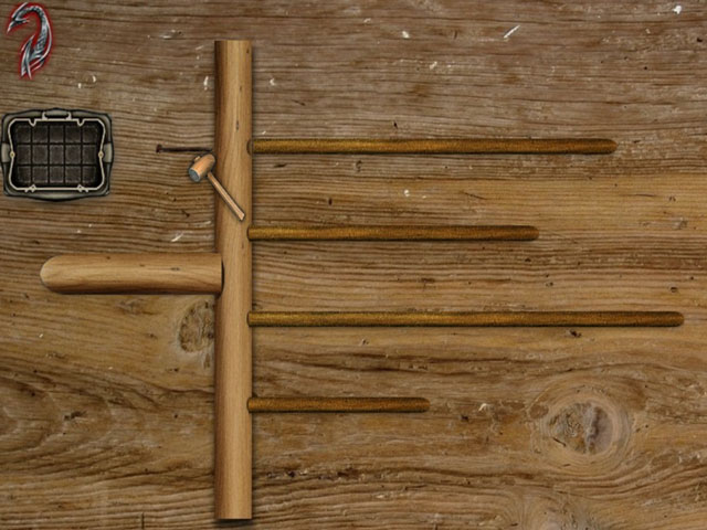 Opusťte pokoj a po schodech do mezipatra. Tady si na stěně všimněte svícnu a zvláštního obrysu. 0000010414_n04.jpg (87373 bytes) Použijte pak na svícen kleště, aby spadl a podívejte se na stěnu. Všimněte si kovových dírek, ke kterým je potřeba vyrobit nějaký klíč. První ale musíte vyměřit vzdálenost mezi dírkami. Zkombinujte tedy v inventáři měřící pásmo s dřevěnou lžící a pak se špulkou nitě. Získáte měřící nástroj, který si vlevo dole uchopte a změřte každou dírku. Naměříte rozměry 10, 8, 12 a 5 centimetrů. Běžte skrze kuchyň zpět do sklepa a na pracovním stole klikněte na svěrák. Dostanete kompletní pohled na stůl se všemi nástroji a materiálem. Nahoře máte dutý kolík dřeva s dírami. Vlevo dole uchopte hnědý kolík a umístěte jej pod metr. Vpravo uchopte pilu a uřízněte kolik na 10 centimetrech. Zkrácený kolík pak uchopte a dejte jej do pravé horní dírky dutého kolíku. Takto to udělejte i se zbývajícími třemi hnědými kolík, jen pak použijte rozměry 8, 12 a 5 cm a postupně je umísťujte níže a níže. Díry vlevo si zatím nevšímejte. Poslední tedy bude 5 cm zkrácený hnědý kolík. Pak dole uchopte silný světlý kolík a dejte jej po metr. Pilou jej uřízněte na 5 centimetrech a umístěte jej do levé strany dutého kolíku. Poté uchopte pilník a upravte s ním všechny okraje kolíků. Dále vezměte hřebíky a dejte jeden hřebík naproti každého kolíku. Nakonec uchopte kladivo a všech pět hřebíků zamlaťte. Získáte tak klíč do kovových dírek v mezipatře. Jděte tedy zpět nahoru skrze kuchyni do chodby a pak do mezipatra. Označte si vyrobený klíč a použijte jej na dveře ve stěně. Dveře se otevřou a vstoupíte do další tajné pasáže.