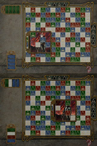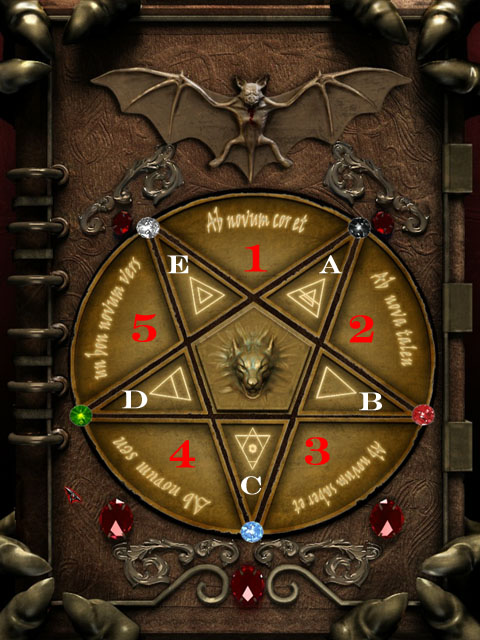 0000010414_n05.jpg (109963 bytes)Vyjděte po schodech, všimněte si díry s bodci a použijte klíč z sejfu na dveře. Octnete se v lóži hraběte Drákuly. Prohlédněte si rakev, zahalené zrcadlo, jeho portrét a knih pod jeho portrétem. Zatím ale neznámé řešení. Všimněte si pak otevřeného okna a usoudíte, že Drákula je asi někde na lovu. Běžte doleva a podívejte se na dveře, které jsou zamčeny, a jedná se o dveře v prvním patře. Nad dveřmi se podívejte na obraz Hradu Drákuly. V pravé části knihovny u okna se podívejte na knihu, která je potřísněna krví. V této knize můžete vidět obrázek podobný diagramu na knize pod Drákulovým portrétem. Jděte tedy zpět doprava a znovu se podívejte na knihu pod obrazem. Než začnete řešit tuto hádanku, tak si dole uprostřed všimněte červeného diamantu, který puzzle resetuje. První se na malých trojúhelnících musí objevit určité symboly, pak na velkých určité nápisy a nakonec se musí pohybovat s krystaly. Jako první klikněte nahoře na netopýra a na jednom malém trojúhelníku se zobrazí symbol. Označme si malé trojúhelníky písmeny A až E. Malý trojúhelník, na kterém se objevil symbol je D. Nyní klikněte na malý trojúhelník A a C, vymění si pozice a pak znovu klikněte na netopýra. Objeví se dva symboly. Dále označte B a E, vymění se pozice, klikněte na netopýra a objeví se další dva symboly. Nyní si velké vnější trojúhelníky označte čísly jedna až pět. Vrchní velký trojúhelník je tedy jednička. Označte první a druhý velký trojúhelník, aby si vyměnili pozice a klikněte na netopýra. Objeví se první nápis. Dále zaměňte první a čtvrtý trojúhelník a opět klikněte na netopýra. Pokračujte záměnou třetího a pátého trojúhelníku a klikněte na netopýra. Nakonec vyměňte první a pátý trojúhelník a získáte poslední nápis. Nyní máte vyznačený všechny symboly a nápisy.