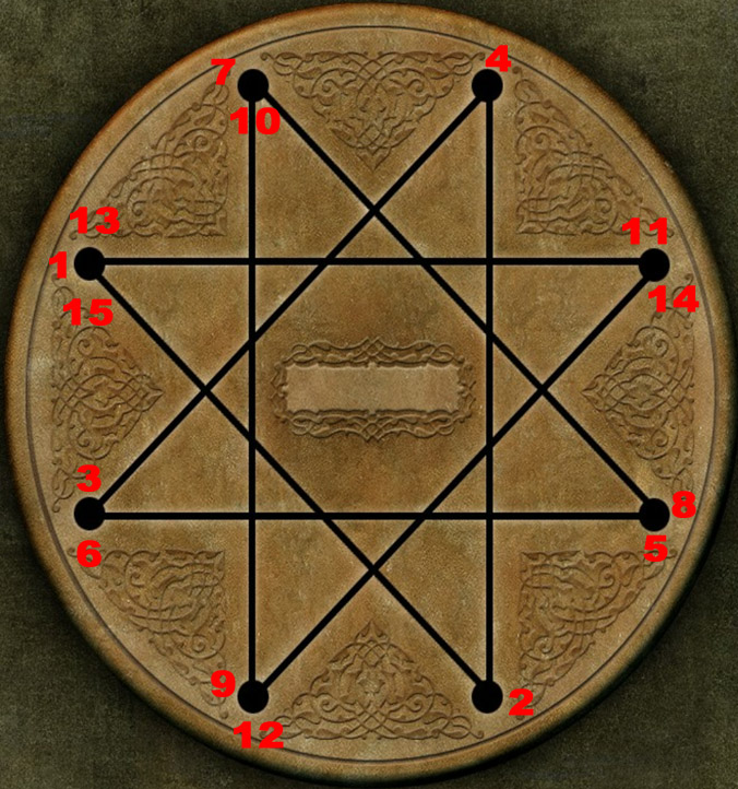Octnete se tedy ve vinném sklípku opatství, ale tajné dveře se za vámi zavřou. 0000010414_n09.jpg (205128 bytes) Všimněte si zabouchaného okna a pod oknem se podívejte na stůl s hlavou draka. Vpravo vezměte z koše látku a v levé poličce seberte sošce svatého Michala kopí. Použijte kopí na hlavu draka a dostanete se k další hádance. Musíte do každého rohu hvězdice dostat kuličku. Vždy když klikněte na jeden roh, tak se zobrazí dvě možné cesty, kam kuličku posunout a určit tak její pozici. Nějaké řešení se špatně popisuje a tak použijte přiložený obrázek a klikejte na rohy od 1 do 15. Skříň se otevře a vezměte z ní klíč a kalich. Běžte dolů a vpravo vezměte rukojeť od koštěte. Podívejte se na soudek šnapsu v poličce a pak na soudek použijte skalpel a šnaps vyteče na podlahu. Běžte doprava a vpravo se podívejte na umučené tělo visícího muže. Pod tělem se podívejte na krysy, které debužírují u nějaké brašny. Krysy jsou ale docela agresivní a netroufnete si na ně. Zkombinujte tedy v inventáři rukojeť od koštěte a látku sebranou z koše, abyste vytvořili pochodeň. Pochodeň zapalte a použijte ji na krysy. Otevřete pak studentskou brašnu a vezměte z ní svěcenou vodu. Běžte dále směrem nahoru do chodby a vlevo si oblečte mnišskou róbu. Jděte zpět a pak doleva. Pojednou za vámi půjde prokletý mnich a zablokuje vám cestu. Použijte tedy pochodeň na vylitý šnaps po podlaze a upálíte jej. Z jeho ostatků seberte klíč a běžte zpět ke dveřím nahoru. Klíčem odemkněte dveře a vejděte do strašlivé místnosti. Spatříte mnichy, kteří uctívají zlo a jeden z nich popíjí z kalichu. Vpravo také spatříte uvězněného bratra Alberta. Jděte doprava a promluvte si s bratrem Albertem. Dále běžte zpět a vstupte do pentagramu s mnichy. Nahoře si všimněte kozí hlavy s kalichem. V inventáři zkombinujte svěcenou vodu s vaším kalichem a kalichy zaměňte. Odejděte a sledujte, co se stane. Jakmile jsou mnichové zaměstnání, tak si běžte znovu promluvit s Albertem. Bratr Alberto má bohužel zlomenou nohu, takže jej nemůžete vysvobodit a ani text nemůže přečíst, protože jej mnichové oslepili. Temným klíčem odemkněte dveře vpravo a ocitnete se opět v panství Orlowski. Tady se dozvíte, že hrabě Drákula unesl Minu. Vydáte se tedy na poslední cestu...