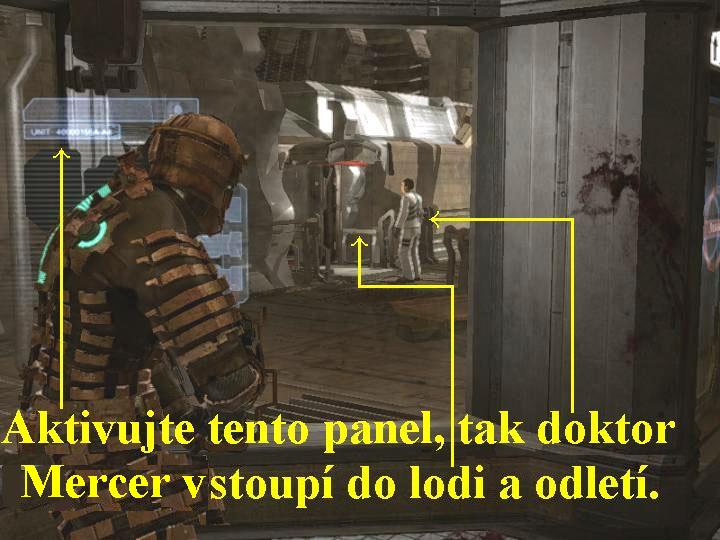 Otočte se, popojděte vpřed, uslyšíte poslední blouznivá slova umírající dívky, seberte u ní kinetický modem. Kolem dívky pokračujte do chodby, bedny si odstraňte pomocí kinetického modemu (F+pravé tlačítko myši), na konci chodby projděte dveřmi. Zde obdržíte novou zprávu a zároveň i úkol, zničit barikádu a získat RIG kapitána Benjamina Mathiuse, napřed ale musíte najít výbušninu TERMIT a defibrilátor. Projděte tedy dveřmi Výzkumné křídlo, seběhněte dolů po schodišti a pokračujte doleva, na další dveře použijte zpomalovač předmětů (C+pravé tlačítko myši), poté projděte dveřmi Hlavní laboratoř, za nimi skolte několik bestií. Ze skříňky označené písmenem C si doplňte plazmovou energii, poté vstupte na nákladní výtah, aktivujte jeho panel, tak sjedete níž, kde ihned pobijte několik mutantů. Na panelu si doplňte stázi, dveřmi vstupte do malé místnosti, kde vyberte skříňky (lze otevřít pouze ty, označené modrým světélkem). Projděte dvěma dveřmi Biologická laboratoř, na konci chodby spatříte za sklem člověka, kterého právě zabíjejí bestie, tomu už nepomůžete, dokud ho neusmrtí, ani se dál nedostanete. Jakmile tedy člověk zemře, vstupte zleva dveřmi do laboratoře, pobijte vražedné bestie, v místnosti se ve vitrínách nacházejí lidská embrya v živném roztoku. Jděte vpřed, nastupte si na další nákladní výtah, aktivujte jeho panel, tak vyjedete výš. Zlikvidujte několik monster, projděte protějšími dveřmi, poté druhými, zajistěte energetický uzel, ze stolku seberte výbušninu TERMIT. Poté co obdržíte další nové pokyny, je vaším úkolem nalézt defibrilátor, projděte tedy dveřmi do Hlavní laboratoře, nato dalšími do Bezpečnostní stanice, odtud pak pokračujte dál dveřmi PTG Křídlo, vydejte se lomenou chodbou vpřed. Narazíte na téměř již zmutovaného umírajícího člověka, ani jemu již není pomoci, pokračujte dál dveřmi vlevo do RTG Sál. Zde si z databáze přečtěte lékařskou zprávu, aktivujte energetický uzel, tak si zpřístupníte další dveře. Za nimi se nachází místnost, kde opět vyberte skříňky, můžete si opravit vaše uzlová spojení, tedy vylepšit si vlastnosti i vybavení na panelu, označeném jako LAVICE, seberte i deskový polovodič ze stolku. Pokračujte vpřed, tak přijdete k znetvořené mrtvole v obrovské trubici, tuto trubici si posuňte stranou pomocí kinetického modemu, jděte vpřed a postřílejte další mutanty. Projděte dveřmi, narazíte na umírajícího člověka, ani tomu již nelze pomoci, za ním však seberte pulzní schéma, aktivujte skříňku s energetickým uzlem. Nyní se vydejte k nákladnímu výtahu, ale ten nefunguje. Pomocí kinetického modemu zvedněte opodál ležící energetický blok a zasuňte ho do otvoru ve stěně. Nyní již je výtah funkční, nastupte si na něj, aktivujte panel, tak vyjedete výš. Použijte kinetickou energii na panel GRIP, tak ho odsunete a zleva ho obejděte a jděte vpřed, na panelu na zdi si obnovte stáze. Posuňte panel GRIP zpět, jděte ke dveřím, vpravo od nich rozstřelte panel, tak si dveře zpřístupníte a tudíž jimi projděte, hned poté druhými do Zóny bezgravitační terapie. Vyberte skříňky a projděte dveřmi, pozor, ocitli jste se ve vzduchoprázdnu, takže pracujte rychle a sledujte vaše zásoby kyslíku, ať se neudusíte. Nyní se vám aktivují vaše gravitační boty, projděte dveřmi ven, aktivujte panel, poté se zaměřte na protější dveře, respektive na plošinku pod nimi (pravé tlačítko myši) a přeskočte si k protějším dveřím na plošinku pod nimi (levý Ctrl), několika dalšími přeskoky se dostanete až ke dveřím, jen podotýkám, že usměrňovat vaše „cestování“ v beztížném stavu je poměrně dosti obtížné. Pomocí kinetické energie si přitáhněte z prostoru před vámi energetický blok a zasuňte jej do otvoru vpravo ode dveří, teď tedy již dveřmi můžete projít. Vyberte skříňky a ze stolku seberte defibrilátor, obdrželi jste nový úkol zničit barikádu. Vraťte se tedy dveřmi zpět, pobijte objevivší se mutanty a stejným způsobem se přeneste nazpět k vstupním dveřím. Projděte jimi, na konci vpravo druhými, zabočte doprava, zabijte mutanta, pokračujte vpřed a projděte dveřmi do RTG Sálu, vstupte do chodby a na panelu na zdi vpravo si hru rozhodně uložte, určitě byste si nechtěli vaše cestování v beztížném stavu znovu zopakovat. Pokračujte chodbou dopředu, zabočte doleva a kinetickým modulem si přitáhněte k sobě podlážku s cedulí GRIP, poté ji obejděte, zbavte se mutantů a jděte k výtahu, na něm aktivujte panel, tak sjedete níž. Zbavte se dalších mutantů, pokračujte chodbou vpřed, dveřmi vlevo se vracejte do bezpečnostní stanice. Pozabíjejte mutanty, doplňte si stáze, pokračujte dopředu lomenou chodbou, na jejím konci projděte do dveří vpravo s názvem Bezpečnostní stanice. Na zvýrazněné místo před vámi uložte nálož TERMIT, ta automaticky vybuchne, obdržíte další zprávu a nový úkol, získat RIG od mrtvého kapitána Benjamina Mathiuse. Projděte dál nyní již zpřístupněnými dveřmi s názvem Nemocnice lodi Ishimura, přečtěte si videozáznam, z nějž k vám pohovoří Nicolle, vaši přátele jsou tudíž přesvědčeni, že se nachází někde poblíž a je živá. Pokračujte chodbou vpřed, vstupte do dveří se stejným názvem, poté projděte dveřmi vpravo na Pohotovost, v místnosti pobijte několik malých zmutovaných bestií. Ze země seberte pomocí kinetického modemu energetický blok a zasuňte ho do otvoru vpravo ode dveří Chodba pohotovosti A. Zde postřílejte další zmutované bestie, vpravo po aktivaci energetického uzlu můžete projít dveřmi do malé místnosti, kde vyberte skříňky a získáte tak něja