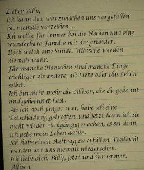 Allison McAllisterové. Píše v něm o zmizelém příteli Billym a žádá vás