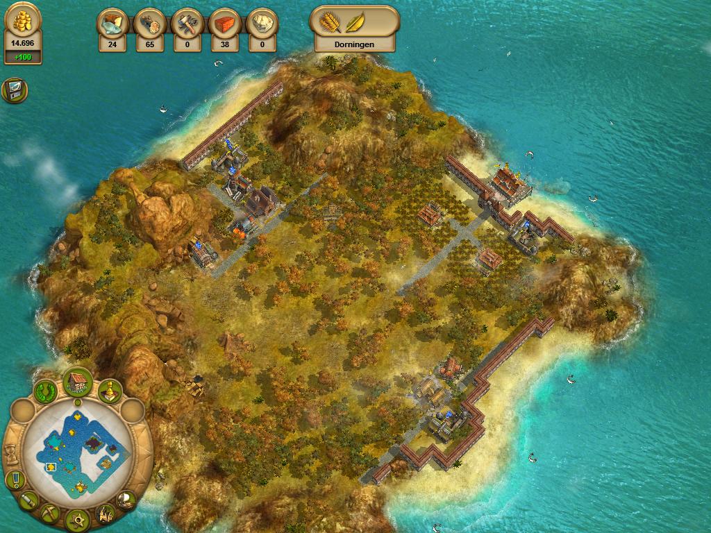 na západě objevíme ostrov s obětitěm, do kterého se má dát olej. Tenhle úkol zatím vynecháme a snaíme se dostat osadu na úroveň,