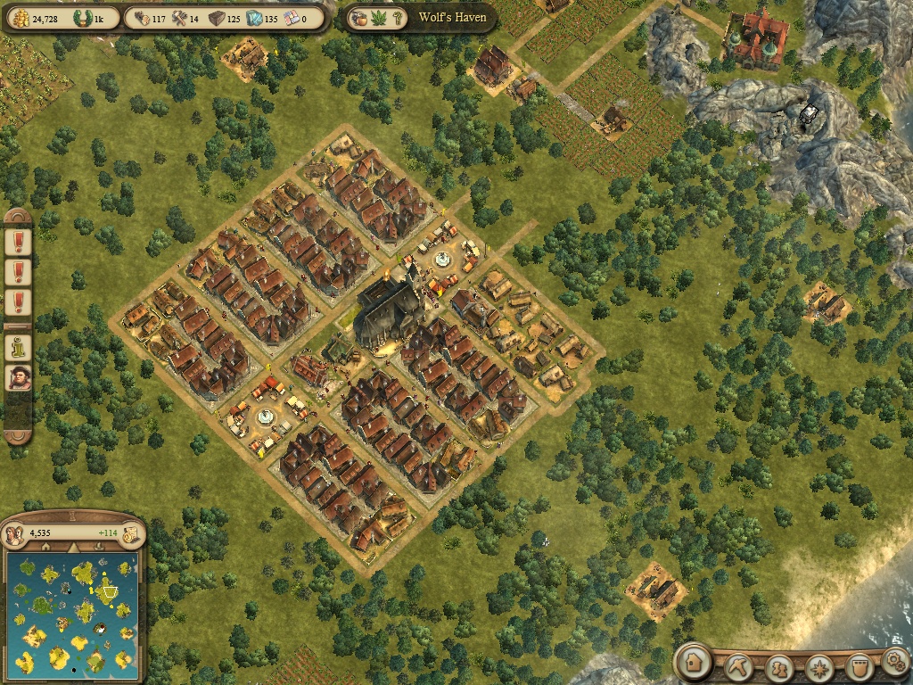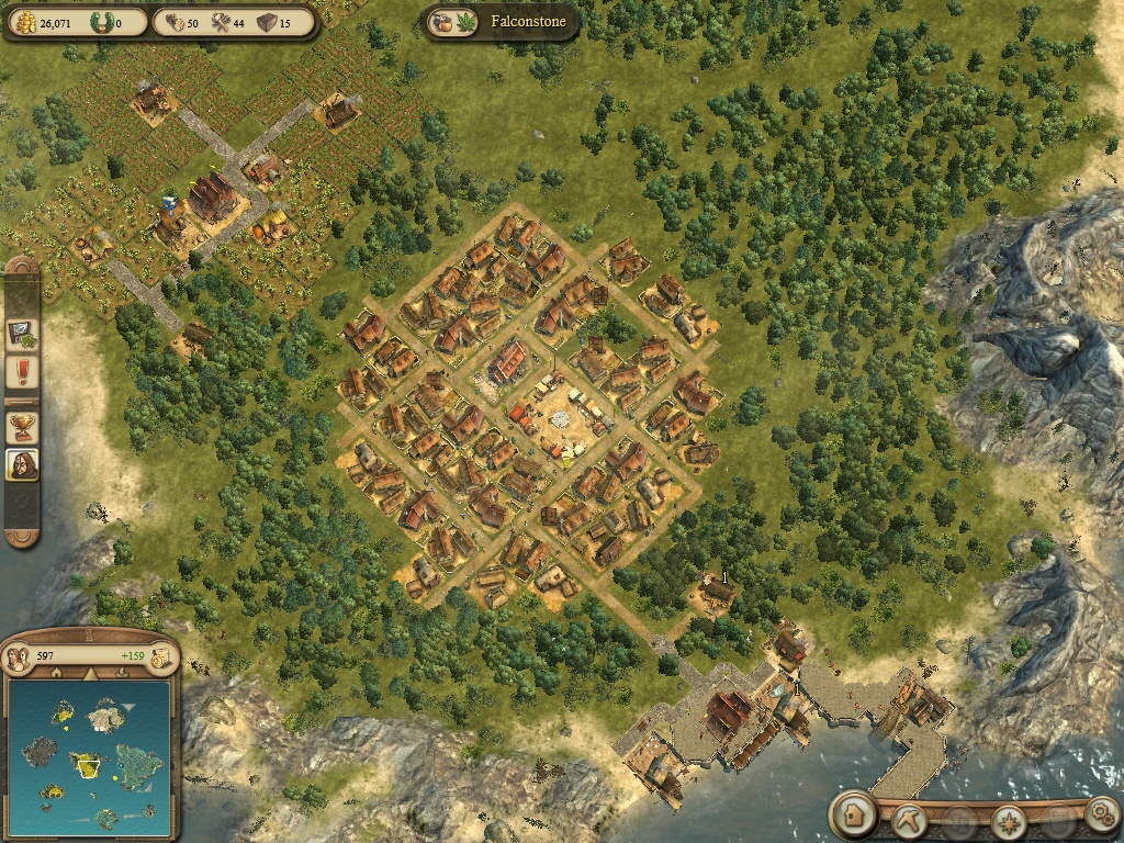 Na začátek pár rad k volné hře. Vyberte si ostrov na kterém je možnost pěstování cider (to k pití, asi jablka na mošt, nechám angl. název), konopí, obilí, léčivé rostliny. Suroviny: kámen, železná ruda, solisko. Dále NUTNĚ potřebujete ŘEKU. Jedině na ní se dají stavět některá budovy. V orientální části (jižní ostrovy) jsou to datle, koření, indigo, hedvábí, káva. Suroviny: fialový důl na Quartz (z čeho se dělá sklo a mozaika), hlína. Napsal jsem to v důležitosti pořadí. U každého ostrova je u řádky co se tam pěstuje otazník, u obchodníku si můžete koupit svitek, který umožní pěstovat chybějící surovinu. Než si ho dáte do skladiště a aktivujete, POŘÁDNĚ SI TO ROZMYSLETE, ZMĚNA JE NEVRATNÁ. Až se dostanete na vyšší úroveň, budete možná potřebovat něco jiného. Proto si alespoň na jednom ostrově nechte možnost doplnit pěstování něčím potřebným. A to na jednom severním a jednom jižním ostrově, protože možnosti se liší podnebím.