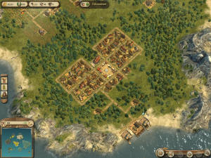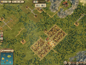 Teď ke stavbě osady. Přístav postavte tak, aby vedle něj bylo místo na další stavby. Pak na hlavním ostrově postavte dva (tři) dřevorubce a až budete mít prozkoumanou mapu, vozte lodí dřevo z ostatních zabraných ostrovů, aby jste co nejdříve osadu vybudovali. Místo dlouhého popisu sem hodím obrázek mojí osady z volné hry. Samozřejmě každý má svůj styl, ale mě se nejvíc osvědčil tenhle. Když budete stavět pole, vyhněte se chybě kterou jsem zpočátku dělal a sice automatickou stavbu políček. To se klikne na budovu a na ní na konev. Políčka se postaví automaticky, jenže počítač je trouba a tam, kde se později vešlo maximum políček, tak tam rozhodil třeba jenom 3. Až tedy postavíte hlavní budovu pole, spojte jí cestou se skladištěm a pak klikněte na budovu. V horní části je tlačítko s takovou ohrádkou. Klikněte na ohrádku a můžete stavět jednotlivá políčka na označenou plochu kolem hlavní budovy. Záleží na vás, kolik se jich tam vejde. Na každou výrobní budovu to chce minimálně dvě budovy na suroviny, jinak máte stále problémy. Jo další poznatek. Ať prodáváte u kohokoliv, ceny jsou vždy stejné a koupí i to co prodává (na rozdíl od předcházejících dílů Anno).