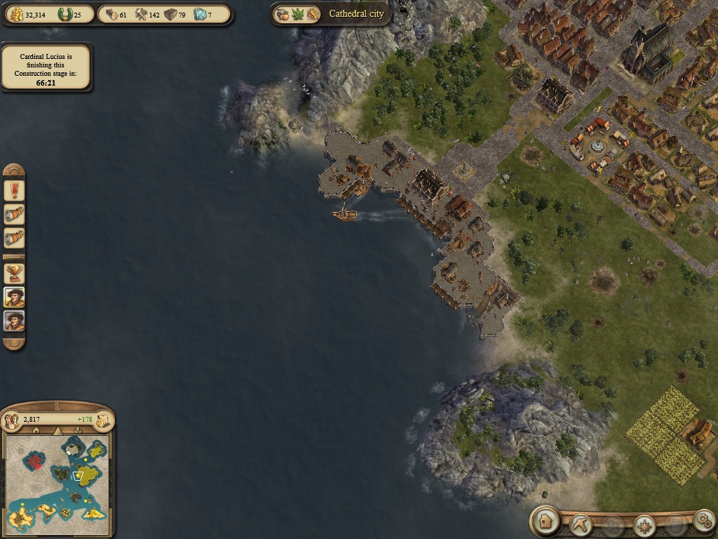 V mezičase jsem projel mapu, Marie na SSV ostrově chtěla 10 košil, po dodání 40 dřeva. Dostal jsem zato kladivo, které se dá do vlastního přístavu a o 50% mi zlevnilo náklady. Jestli ho dostanete taky nevím, myslím že odměna je generovaná. Podruhé jsem to nehrál, tak kdo ví. Když přijedete k lordovi na V ostrov a kliknete na rozestavěnou katedrálu, zahuhlá něco jako zatracení křižáci, zdržují výstavbu katedrály a pak po vás chce 5 kamení výměnou za 5 lan. To můžete opakovat do omrzení a lana mu hned prodat, celkem příjemný výdělek. Další úkol od křižáku je dopravil 10 železa do přístavu Z ostrova. Jak to uděláte Marie připluje se svými poškozenými loděmi do křižáckého přístavu co stavíte a vznese požadavek na jeřáb na opravu. Když lodě opraví, vyrazí na pohany a vykašle se na svoje město na SSV. Když se tam vypravíte lodí, zjistíte, že město pozvolna mizí a od obyvatel dostanete žádost, ať s tím něco uděláte. Máte město obnovit na stav 500 měšťanů. Na lodi doufám máte stavební materiál a tak hned postavte kostel a obnovte ekonomiku. Město je vaše, můžete na něm docela vydělat hodně peněz, tedy až po srovnání ekonomiky.