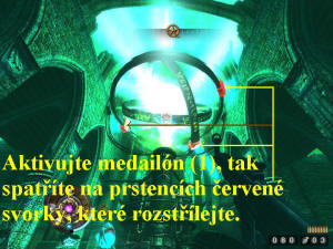 medailónu (2) a střílet do červeně označených částí jeho výzbroje, to je ten